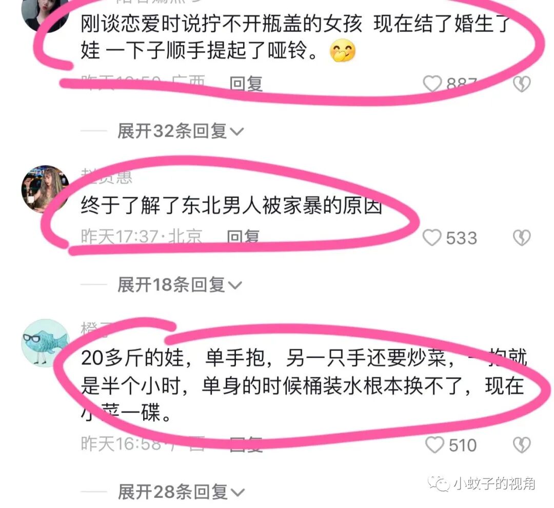 有网友忍不住感慨:刚谈恋爱的时候说拧不开瓶盖的女孩,现在结婚生了娃,顺手就能提起哑铃。