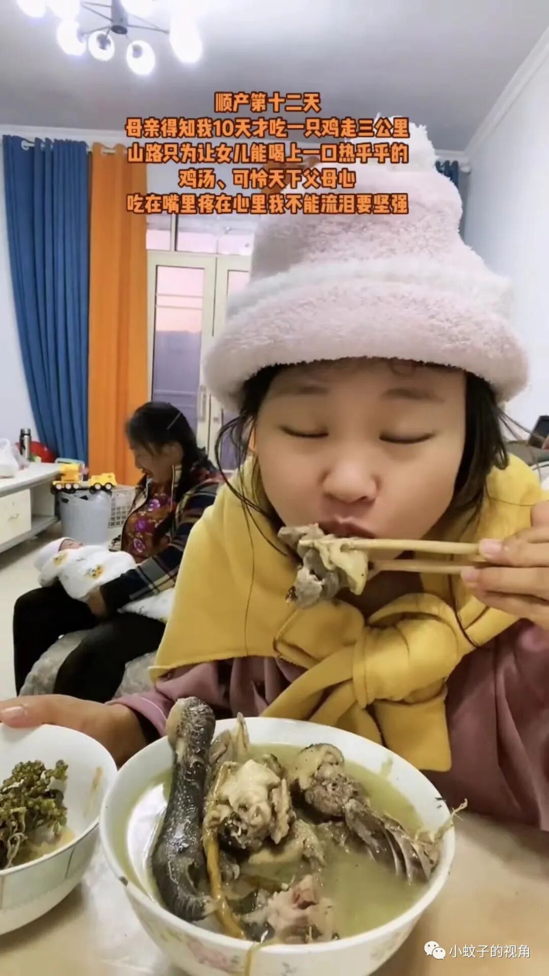 这位女子却比较特殊,顺产已经第十二天了,至今没人伺候月子,十天来只吃了一只鸡。