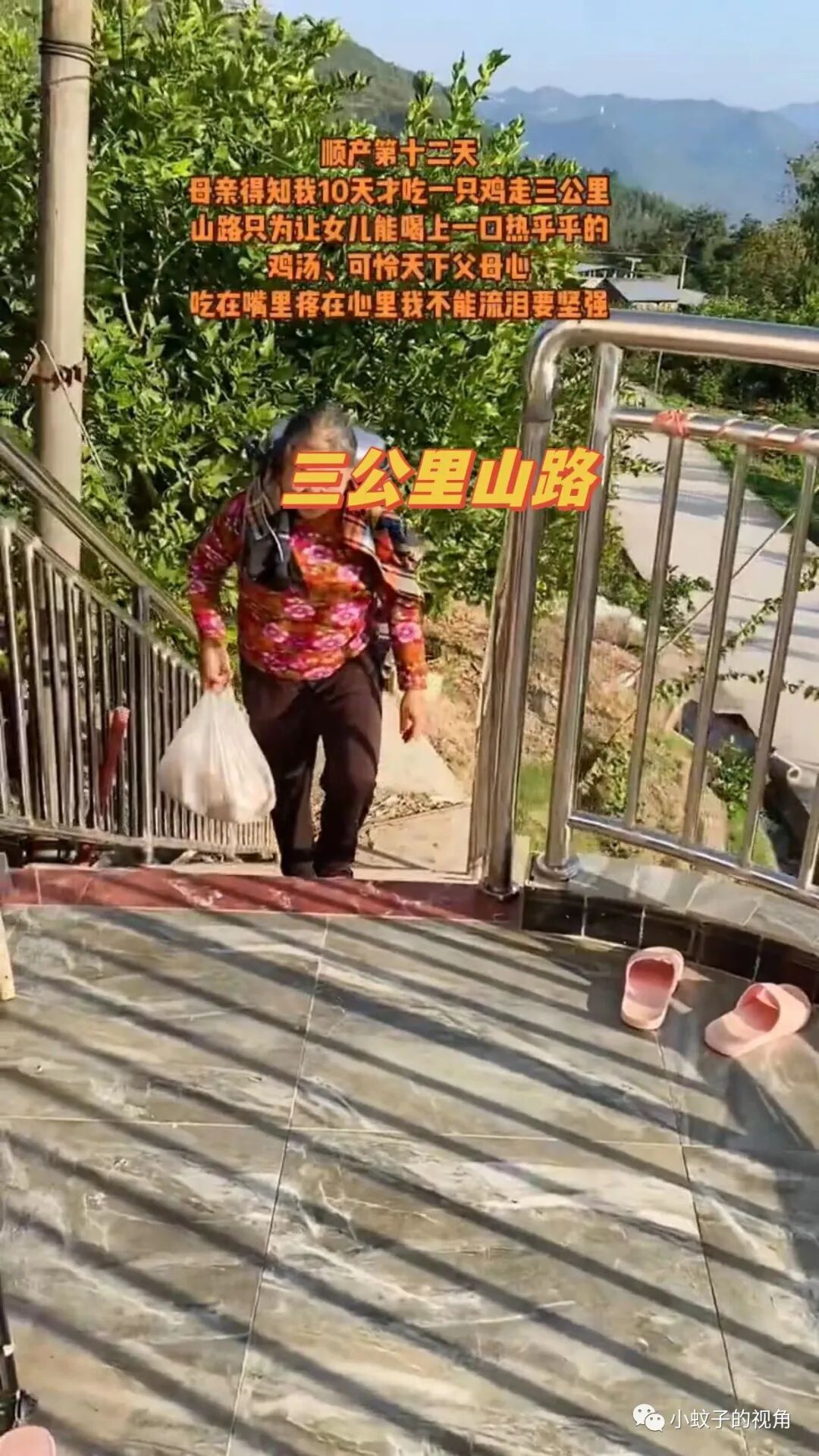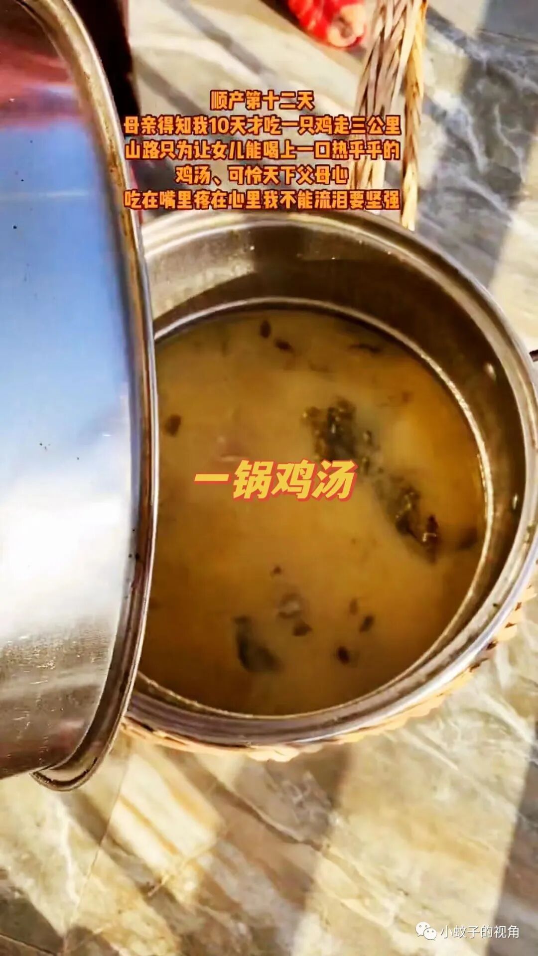 由于都是山路,母亲只好步行前往。三公里山路,母亲硬是背着一锅鸡汤一步步走上来。等她赶到女儿家时,鸡汤还是热乎的。