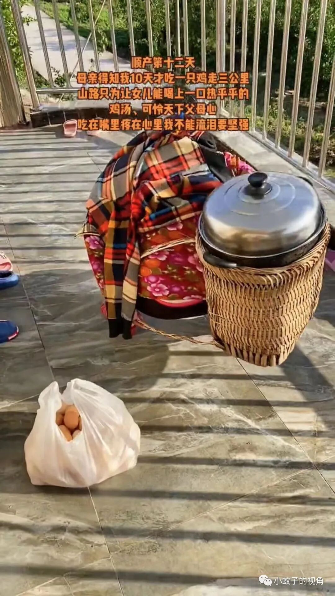 等鸡汤炖好以后,用竹篓把整只锅都装进去,又拿上家里的土鸡蛋,背着一锅鸡汤往女儿家走去。