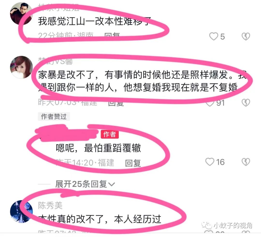 也有网友说得更直接:家暴是改不了的,有事情的时候他还是照样会爆发。我遇到跟他一样的人,现在他想复婚,我不想。