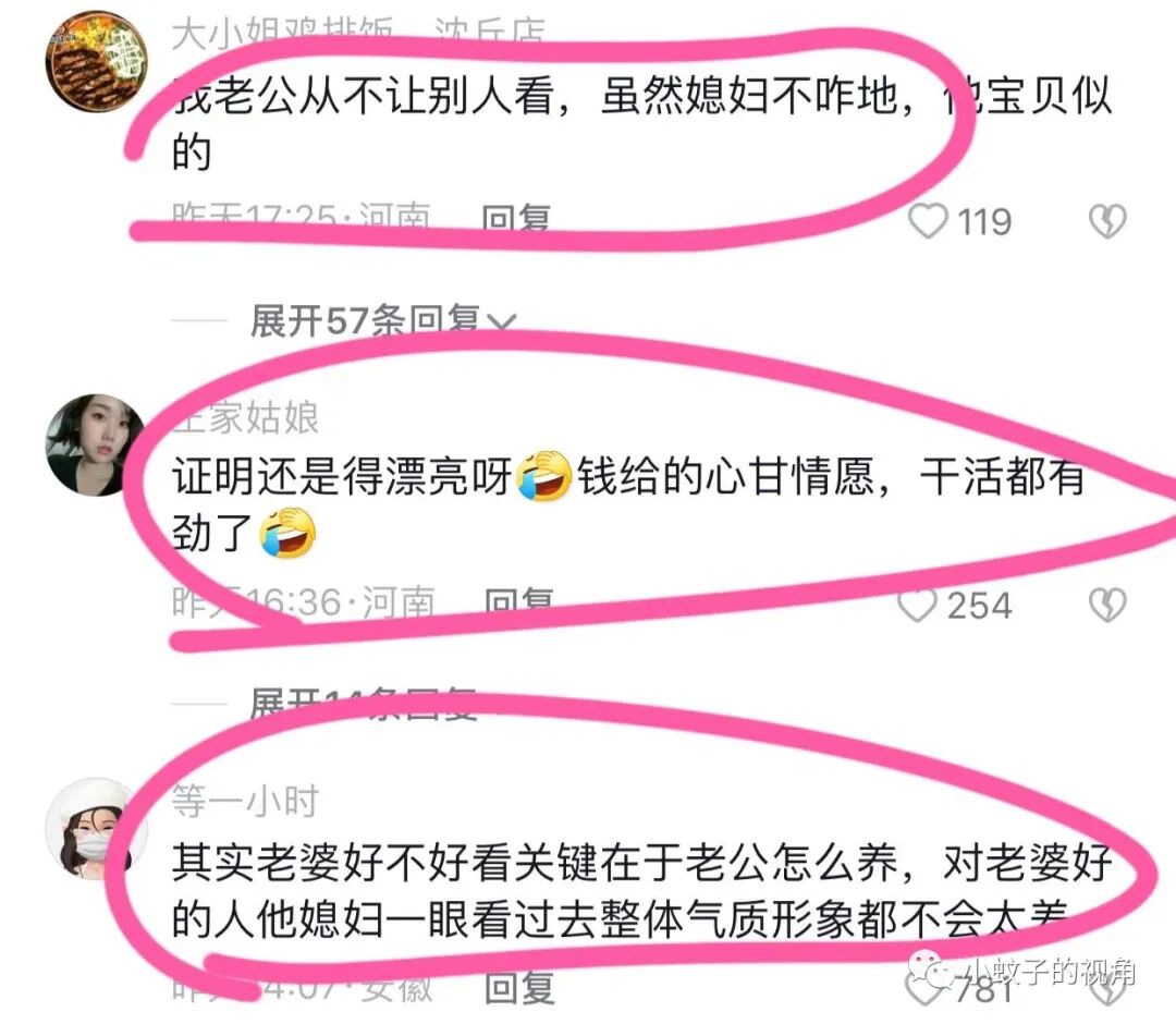 还有网友说:其实老婆好不好看,关键还在于老公怎么养。对老婆好的人,他媳妇一眼看过去,整体气质形象都不会太差。