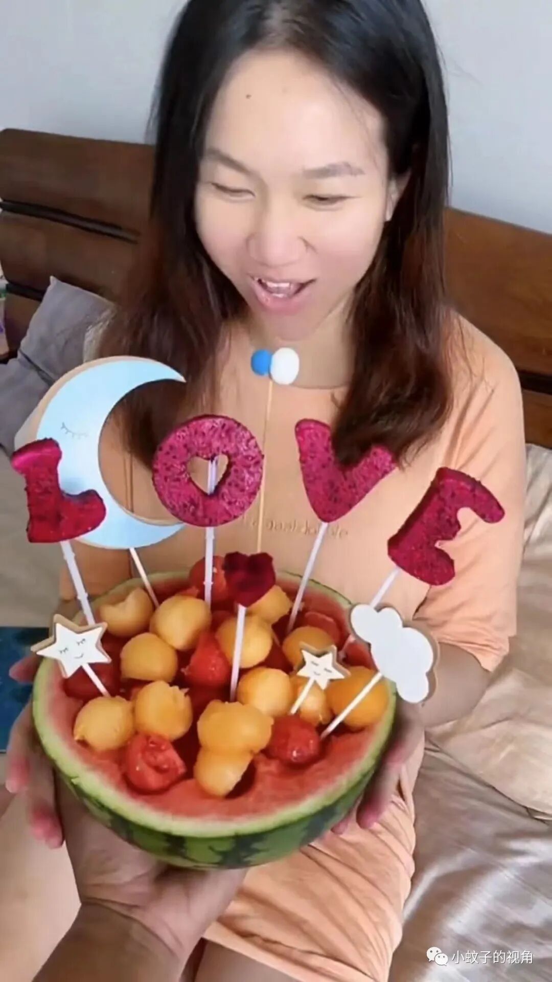 妻子开心地捧着“大西瓜”跟他比了个爱心,“爱你呦”三个字由心而发。