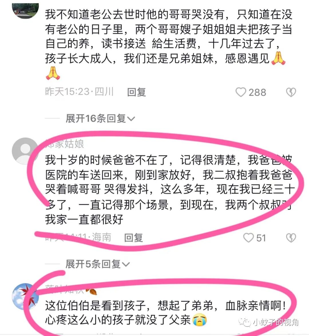 也有网友说:这位伯伯是看到孩子,想起了弟弟,血脉亲情啊!他心疼这么小的孩子就没有了父亲。