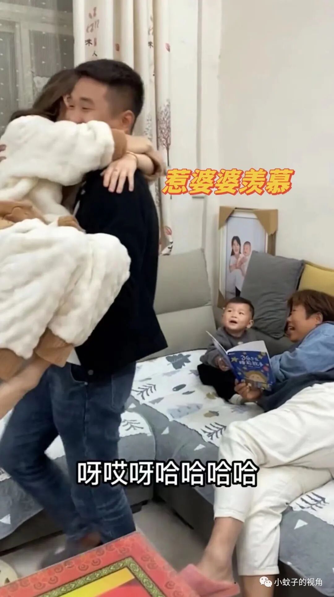 这次媳妇正在跟婆婆一起哄孩子玩耍,儿媳见老公走了过来,伸出双臂想给老公一个拥抱,没想到老公一个公主抱,就把她抱了起来。