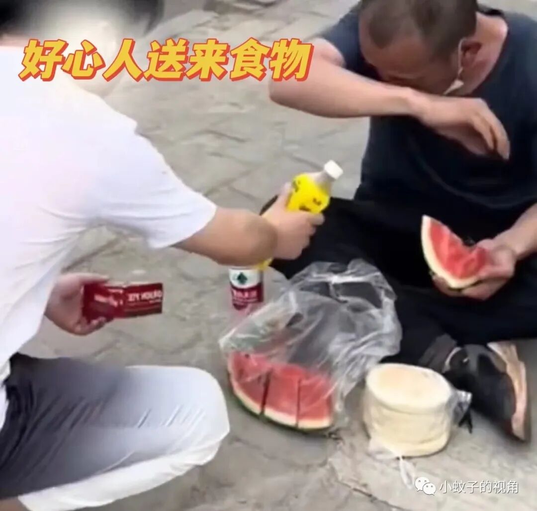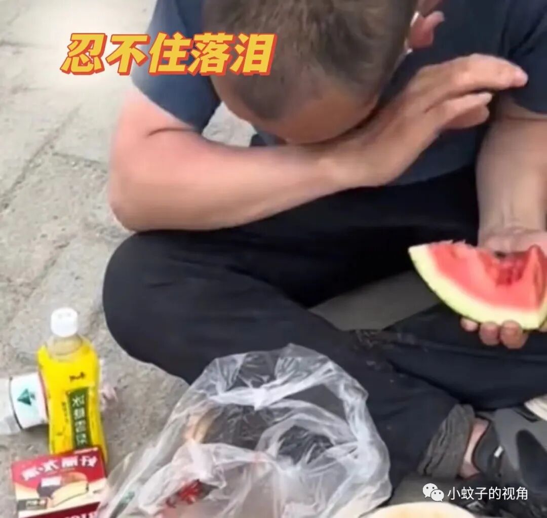 还有人买来了饼干、饮料和西瓜,男子边吃边抹眼泪。诉说着自己找不到工作就没钱买吃的,家里还等着他赚钱养家呢。