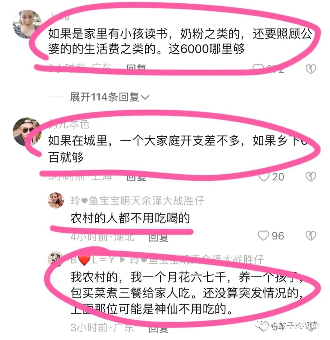 也有网友现身说法:我就是农村的,我一个月花六七千养一个孩子,包括买菜做三餐给家人吃。还没算突发情况的,一个月600块,可能是神仙不用吃饭。