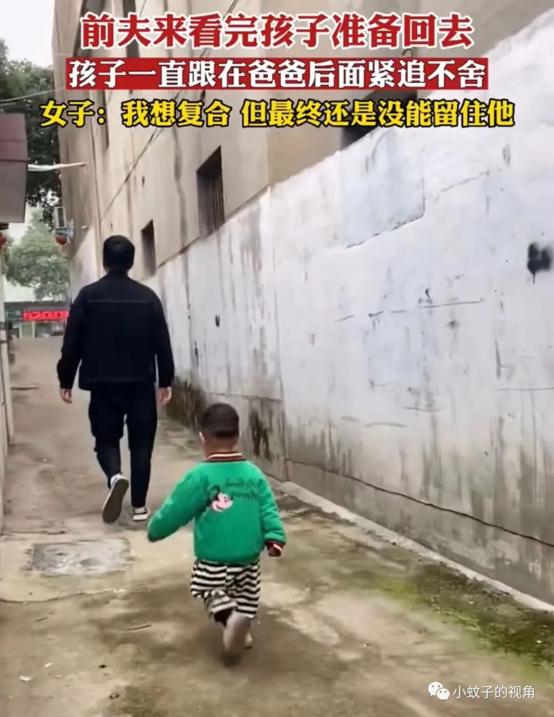 然而孩子却不听这一套,前夫都走出很远了,孩子依然追在他身后,“爸爸、爸爸”的叫声令人听了忍不住泪目。
