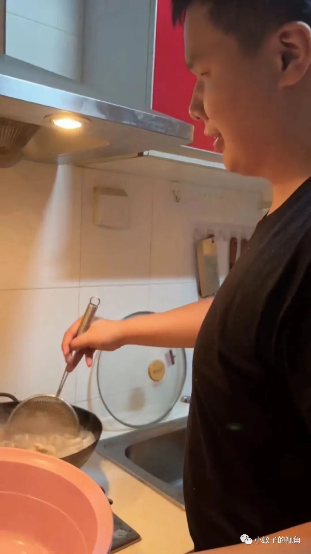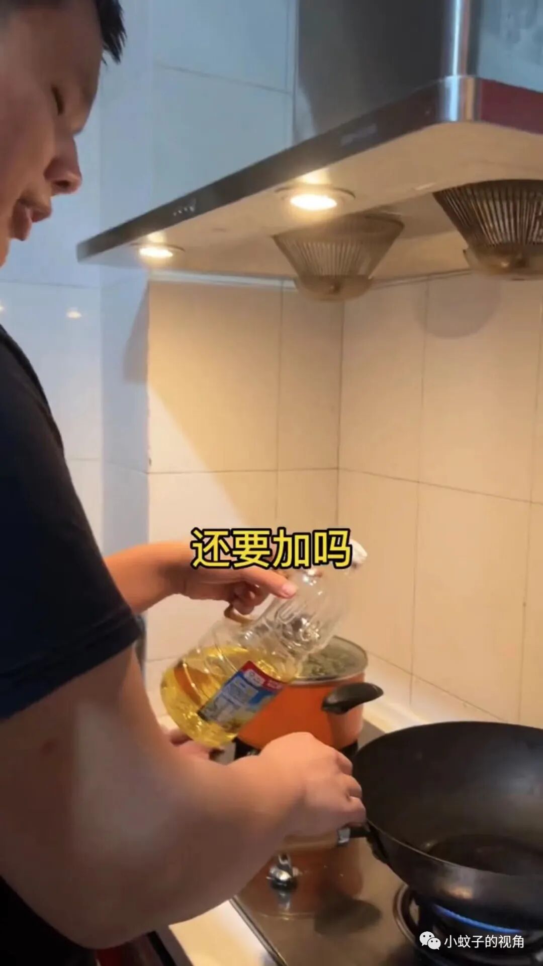 妻子在旁边给他指挥,调料应该放哪一个,应该放多少,什么时候应该放开水了,夫妻二人忙碌又幸福。