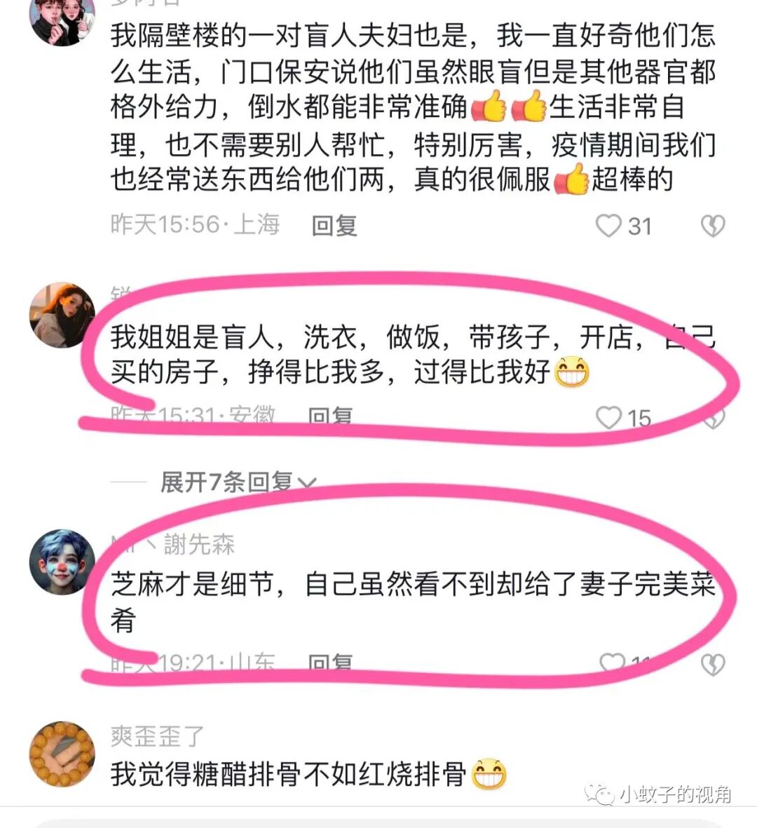 网友纷纷表示羡慕,说:他虽然眼睛看不到,也阻止不了他做好吃的给爱人吃,朱你们一直幸福下去。