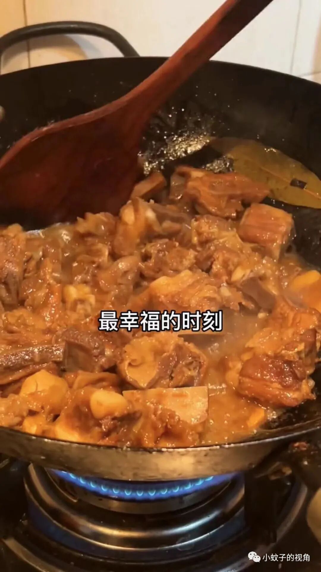 这次老公又要给她做糖醋排骨,看着老公认真地给排骨焯水、炒糖色,还自言自语:“这么多,我们一定吃不完。”