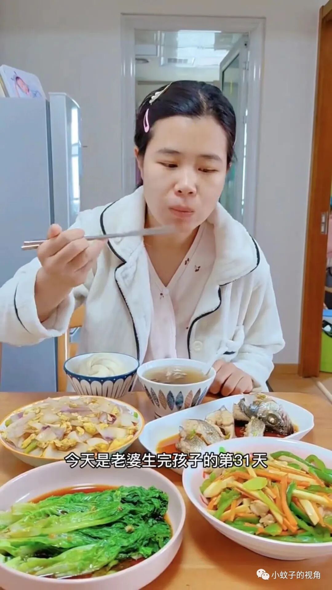 男子表示,老婆月子里消耗也大,这样的伙食能量并不高,老婆并没有长胖。