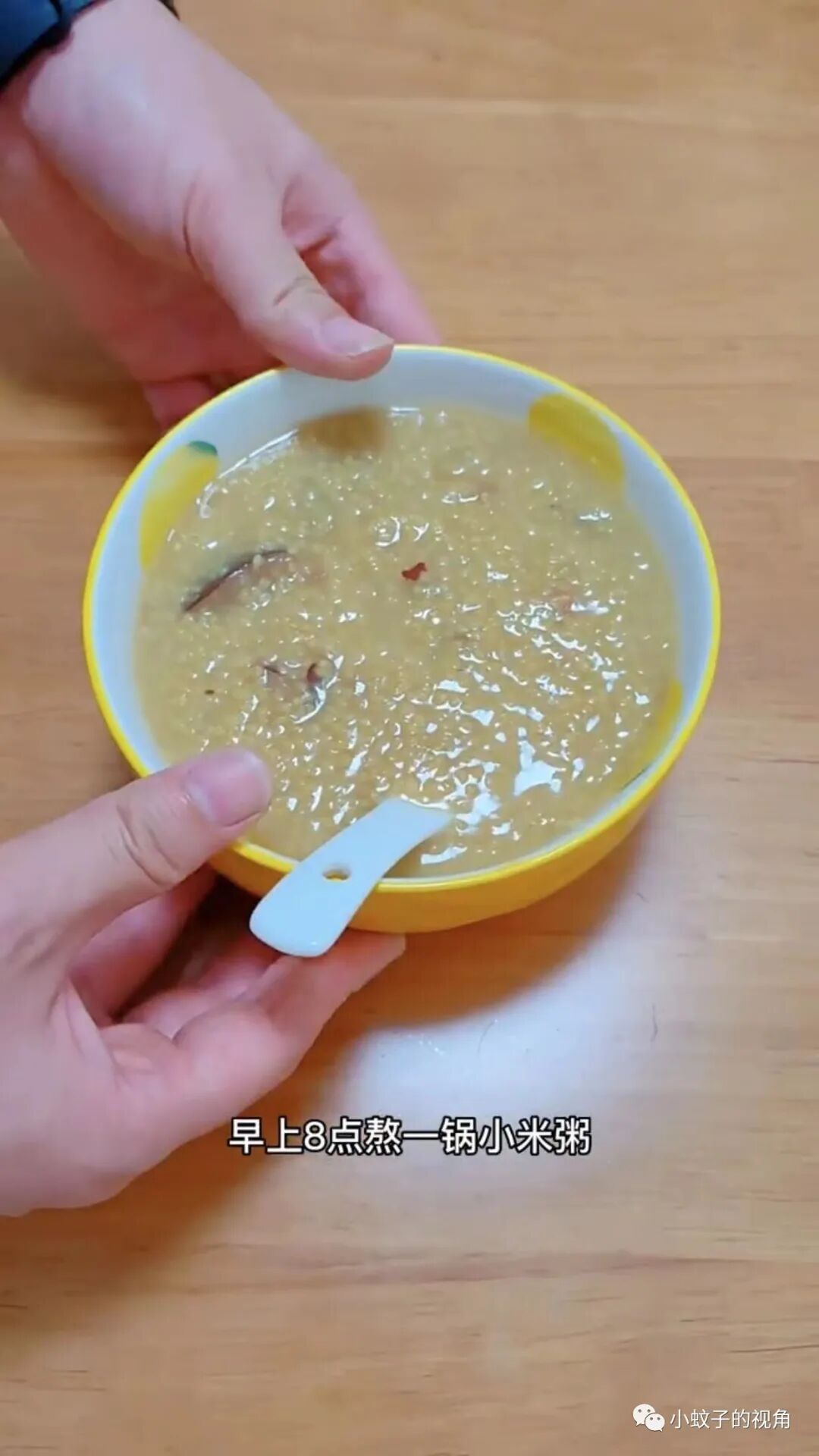 早晨八点熬一锅小米粥,里面还细心地放着大枣。再蒸一碗鸡蛋羹,划开口子加上香油。