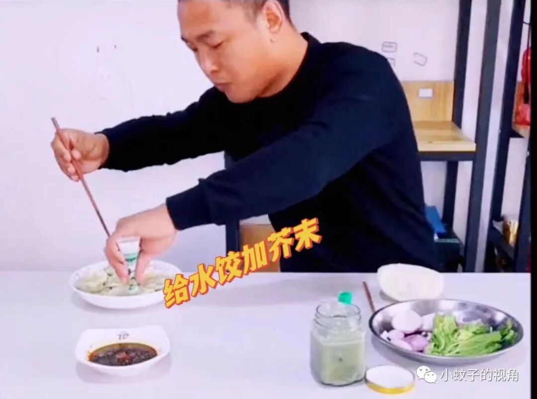 男子在严重心理不平衡的状态下,拿起自己盘子里的芥末,挨个挤进妻子的水饺里,挤完还不忘给水饺翻个身,避免被妻子看到。