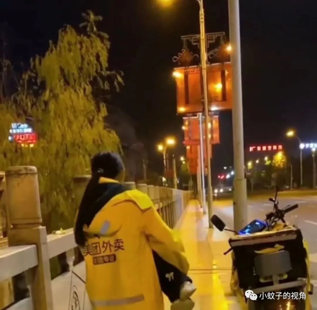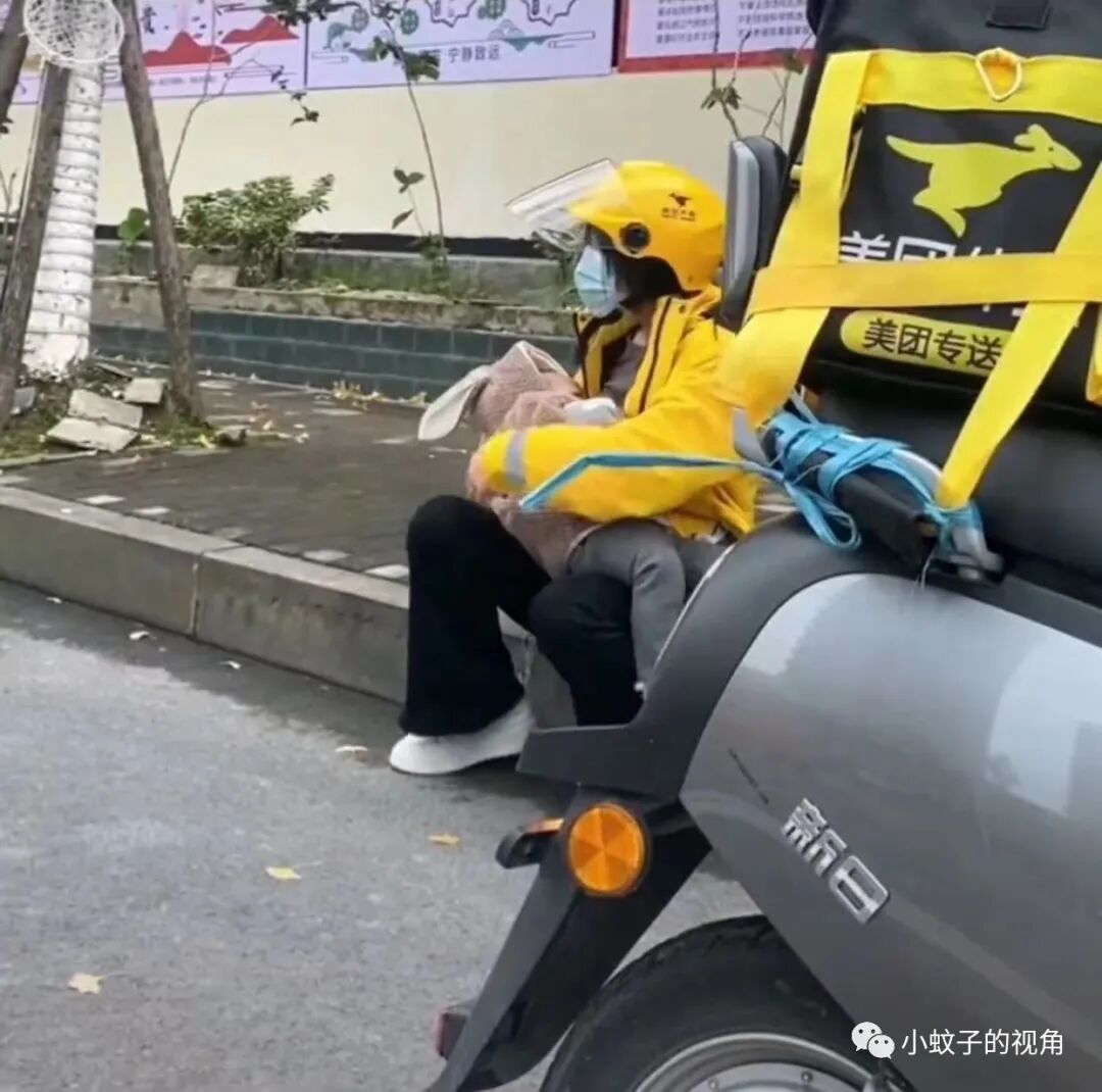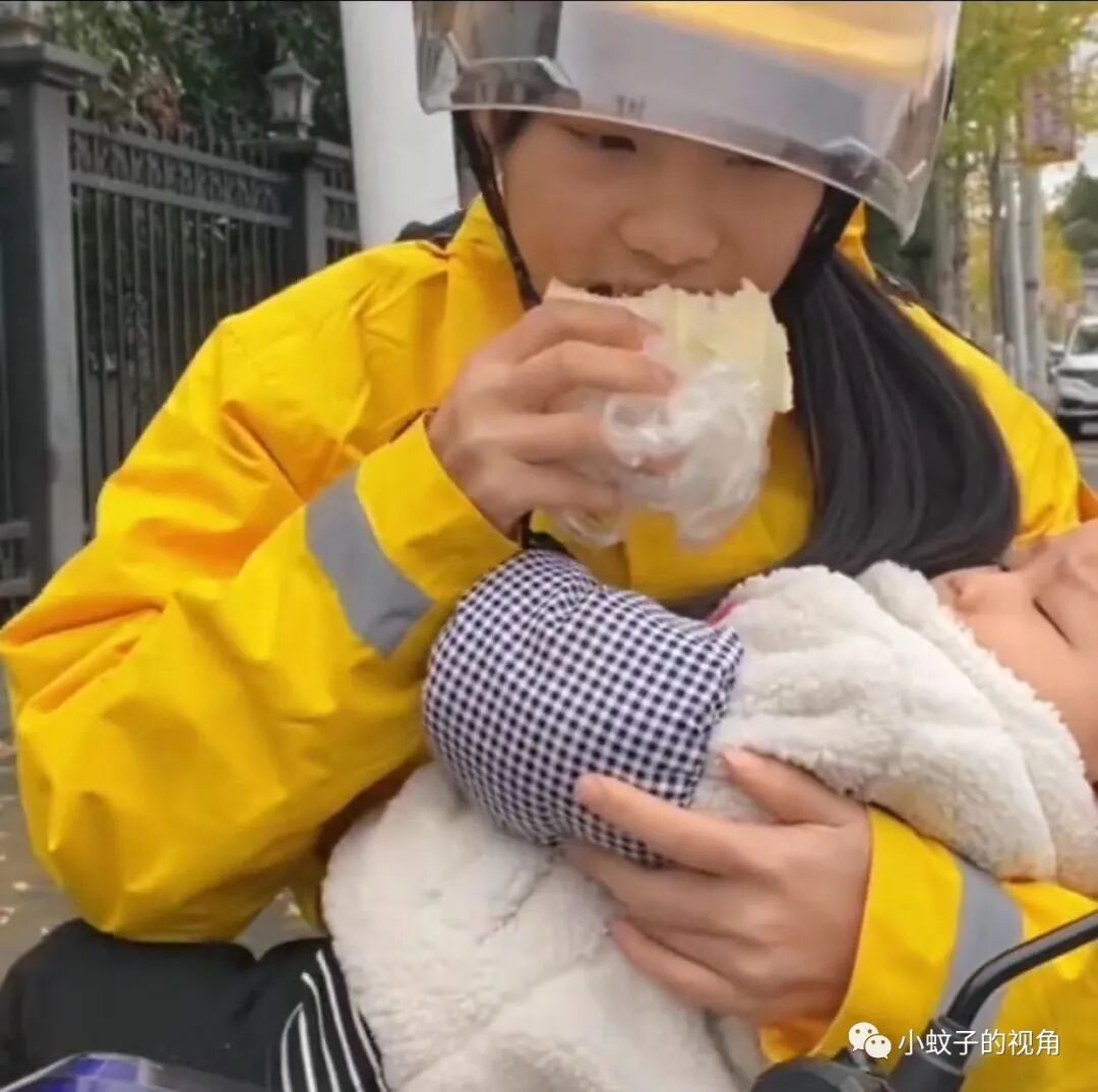 女子说,有时候孩子在半路哭闹不休,她只好放下外卖,抱着孩子哄睡。看着她在路边抱着孩子,摇晃着哄睡的姿势,让人忍不住泪目。
