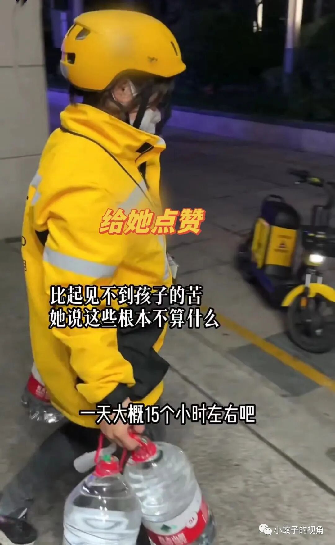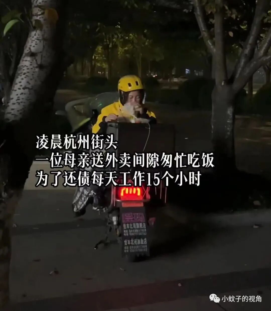 就像杭州的这位妈妈,为了还外债,每天送外卖15个小时,她没哭,孩子一个电话:“妈,我饿了。”她忍不住泪崩。