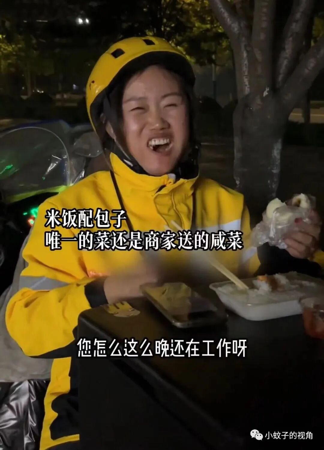 当时这位女外卖员正趴在外卖箱上吃饭,晚饭是米饭配包子,唯一的菜还是商家送的咸菜。