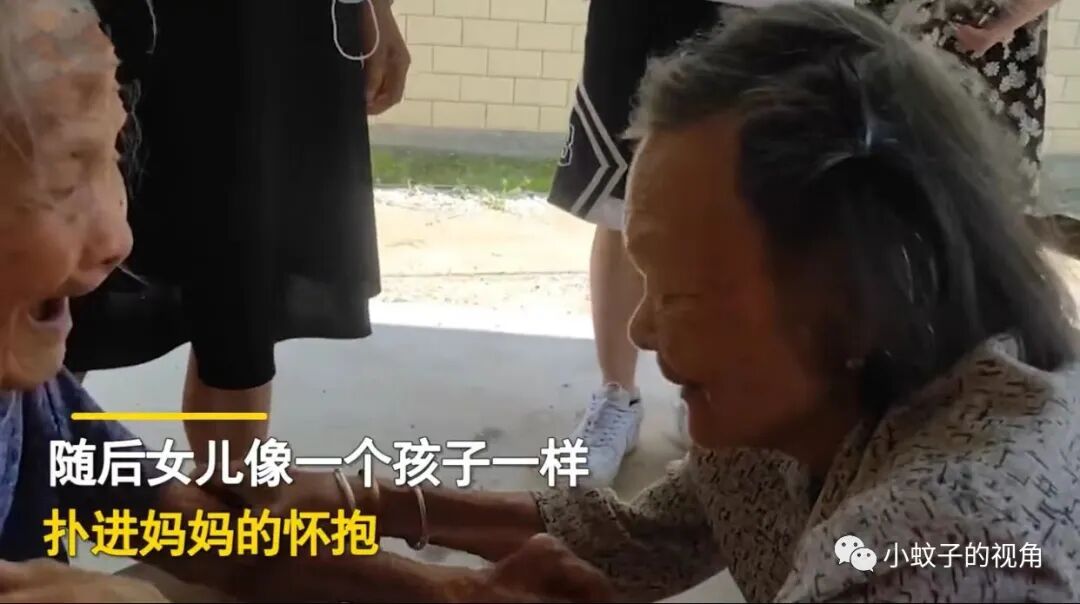 妈妈看到自己的女儿已经头发花白,忍不住摸着女儿的头发,盯着女儿的脸庞,仿佛还在看当年的那个小女孩一样。