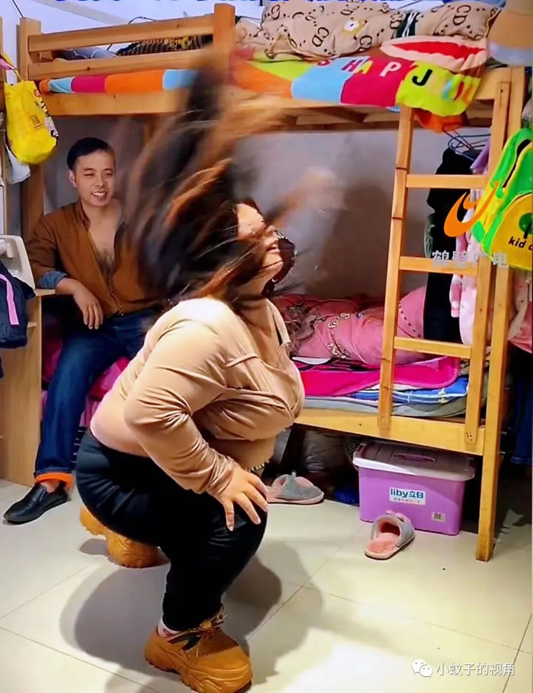 女子身材比较胖,跳起舞来可能有些费劲,但是这点小障碍并不影响她的发挥,只见她转身、甩发一气呵成,动作如行云流水,看来,应该是有舞蹈底子的。