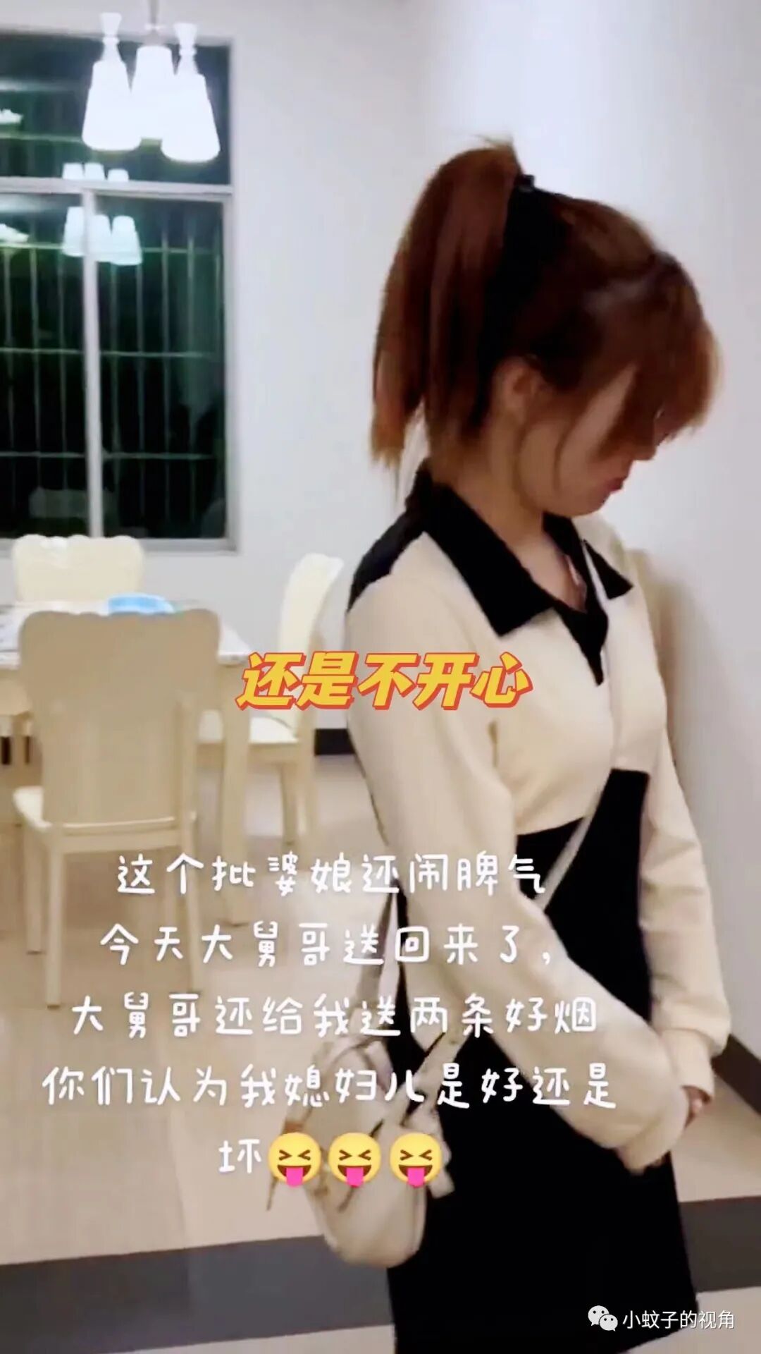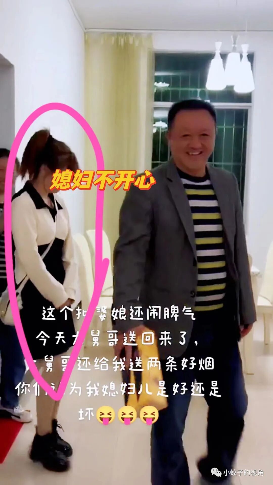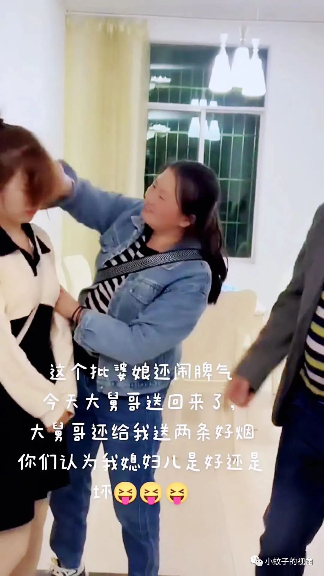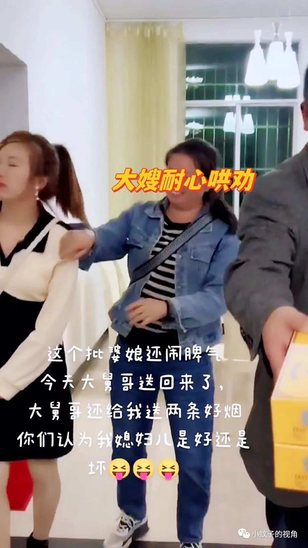 大舅哥手里还拿着两条香烟,大舅哥的媳妇拉着自己的媳妇,自己媳妇撅着嘴,一脸不情不愿的样子。