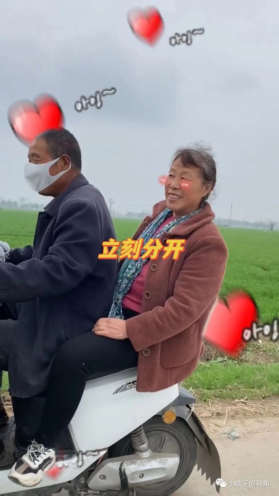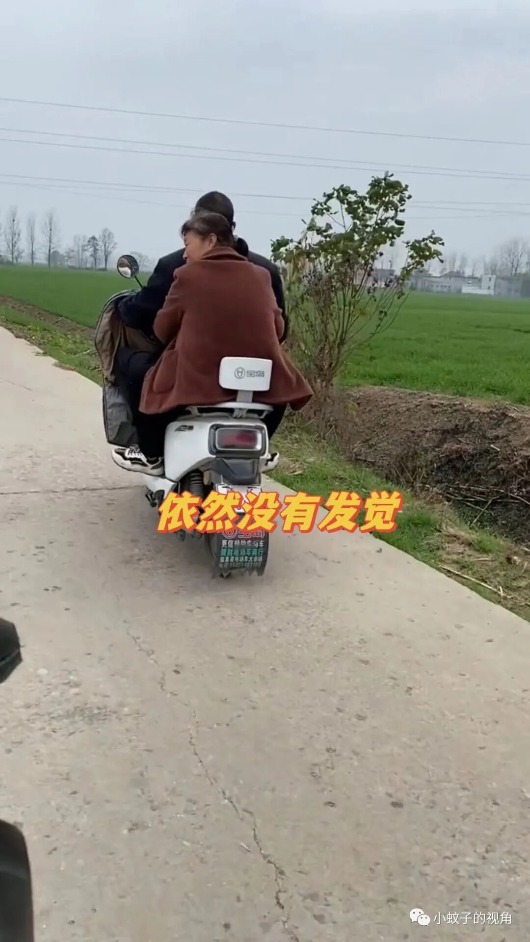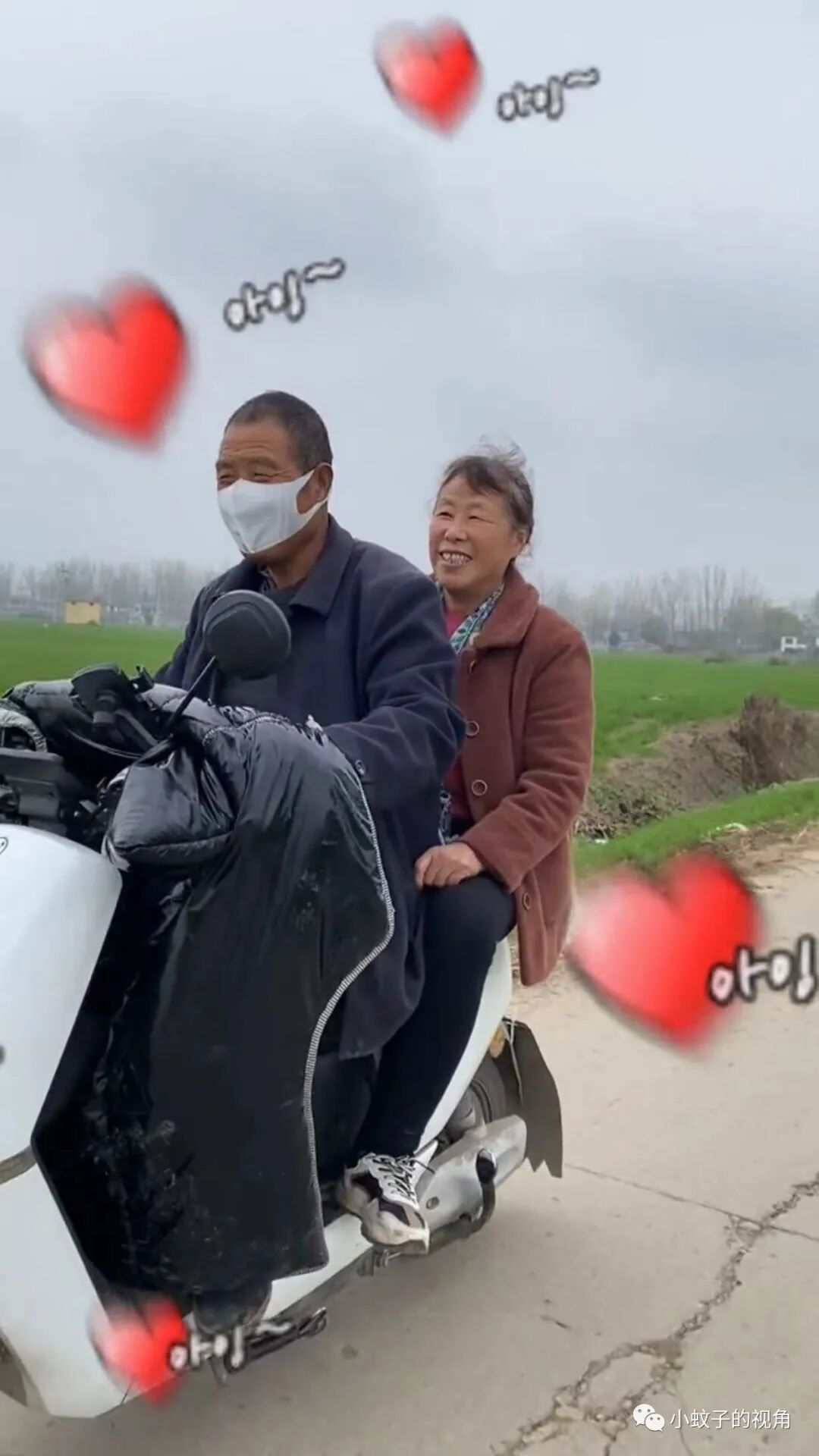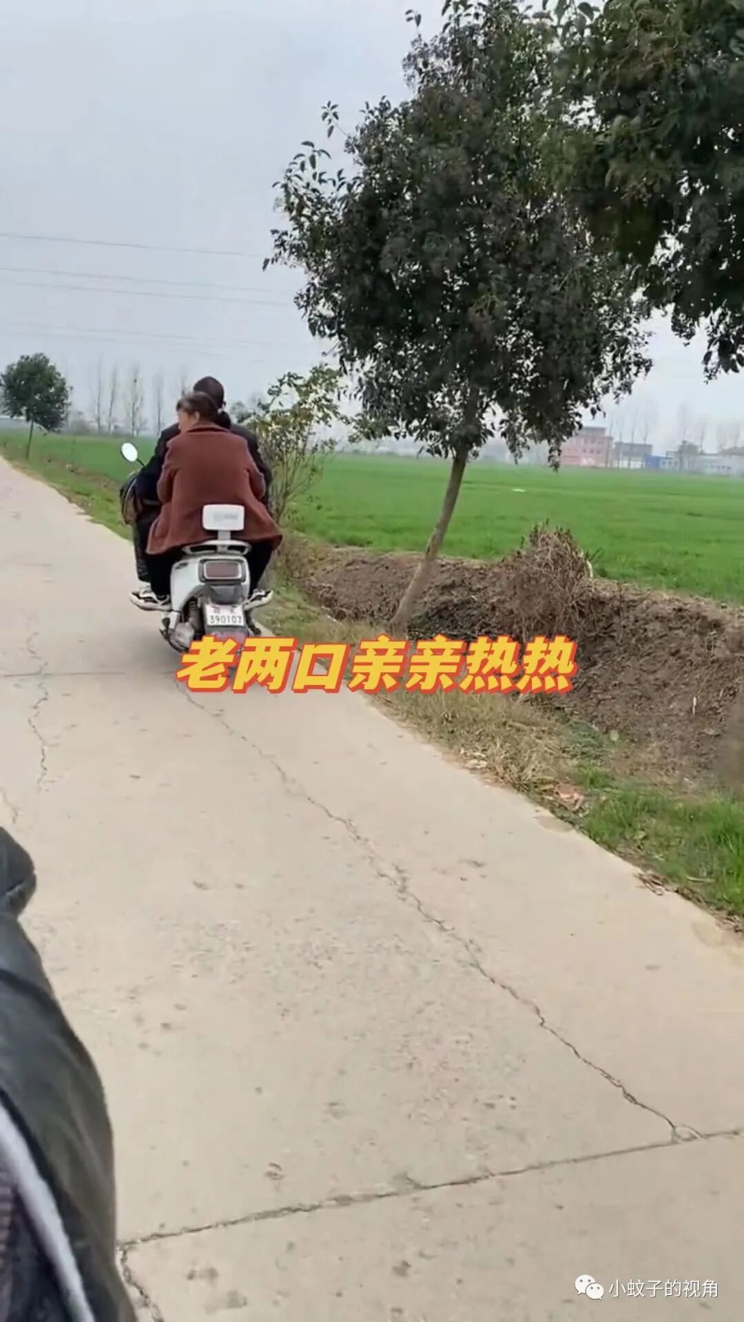 父亲骑着电动车,母亲坐在后面,双手自然而然地搂着老公的腰,脸颊贴在老公后背上,看上去非常甜蜜。