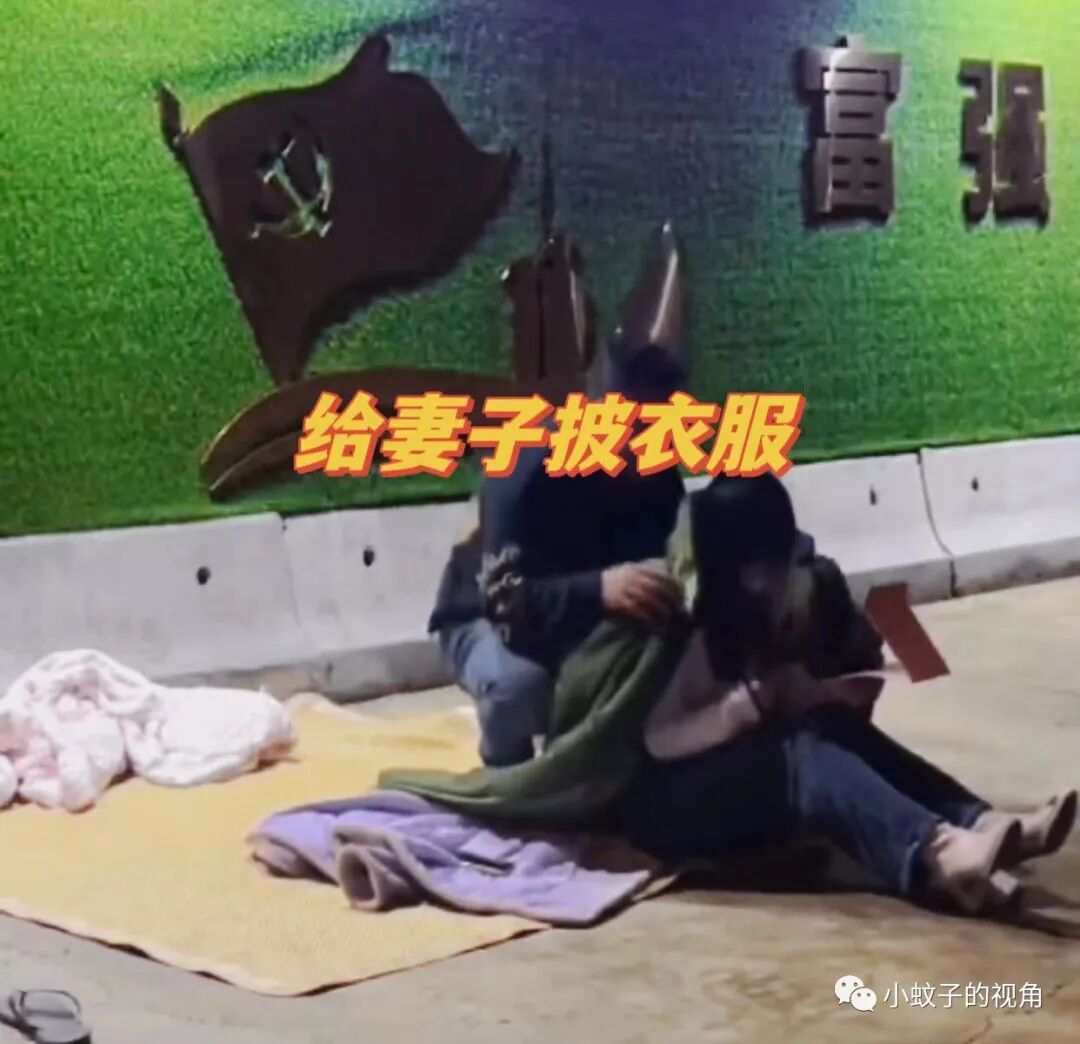 妻子对着老公温柔地笑,纵使露宿在街头,依然隔着屏幕都能令人感受到他们之间的甜蜜和恩爱。