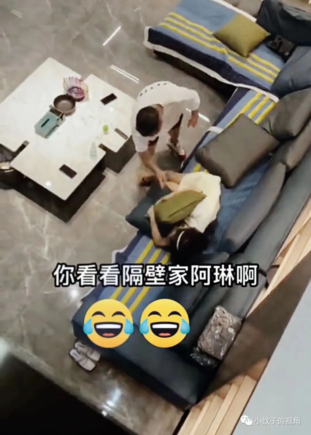 妈妈在楼上听到动静,偷偷在窗户边拍摄,只见女儿一边被爸爸教训,一边抱着抱枕看电视,丝毫没把爸爸的话放在心里。