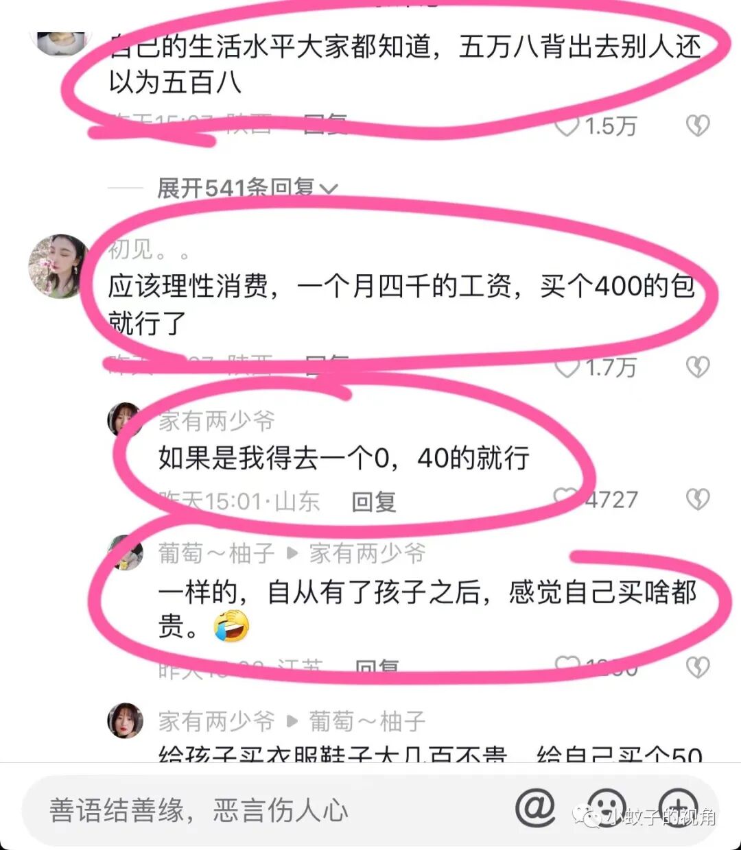 网友说:自己的生活水平大家都知道,你们这样的生活水平,五万八的包背出去,别人还以为五百八。