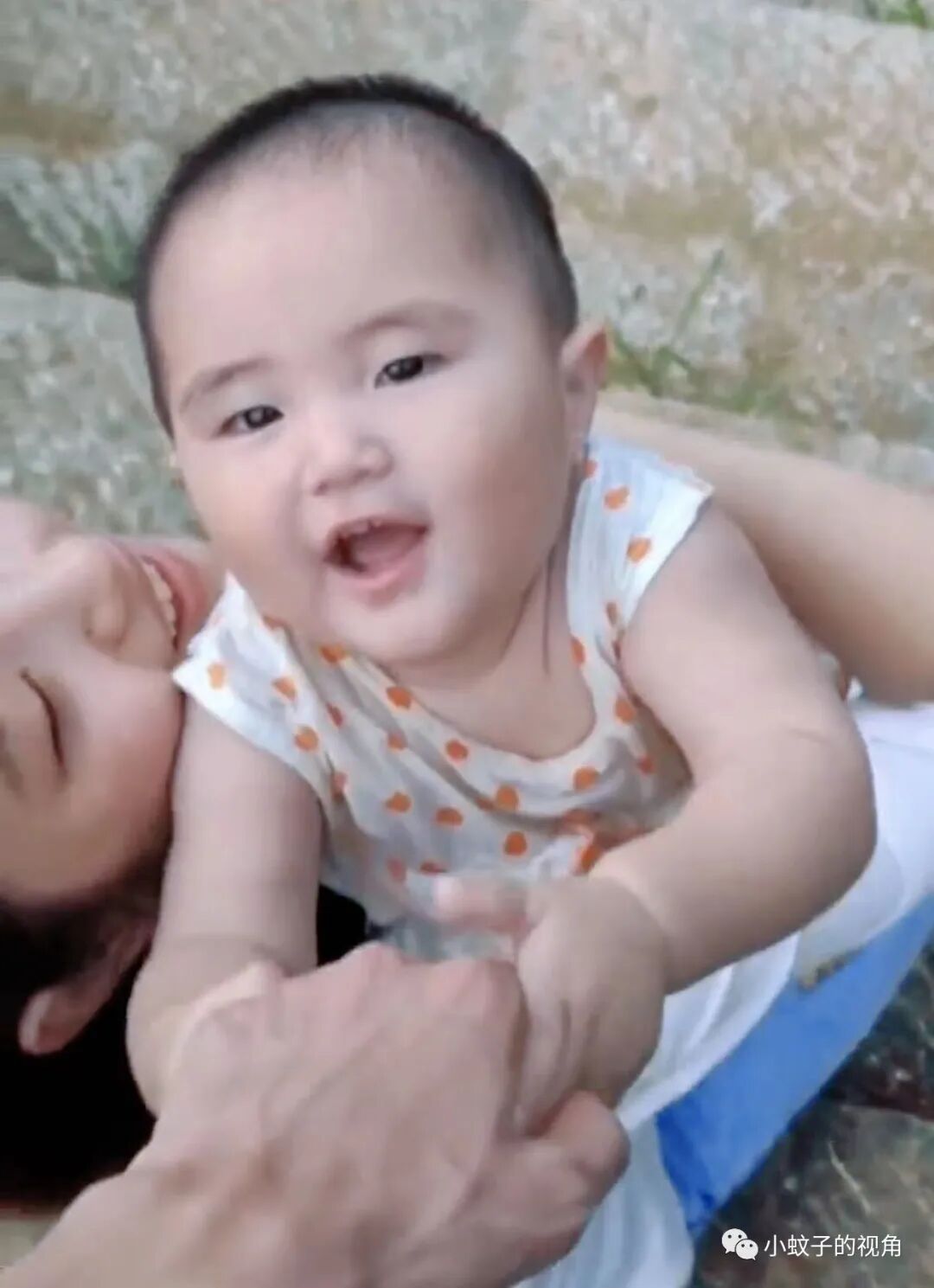 孩子天真可爱,趴在妈妈怀里,小手紧紧地抓着爸爸的大手,笑容天真可爱,看样子被养得很好。
