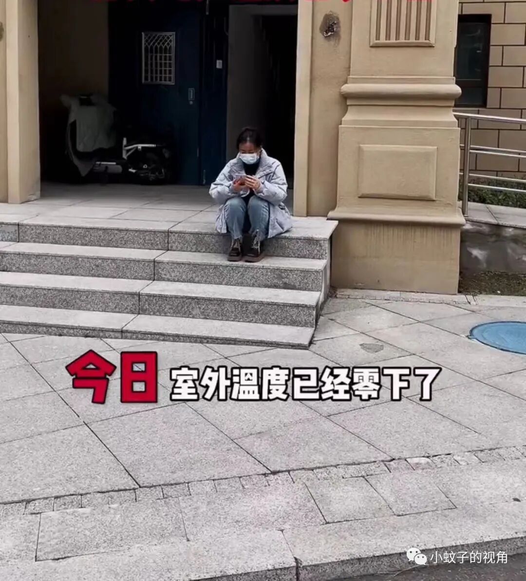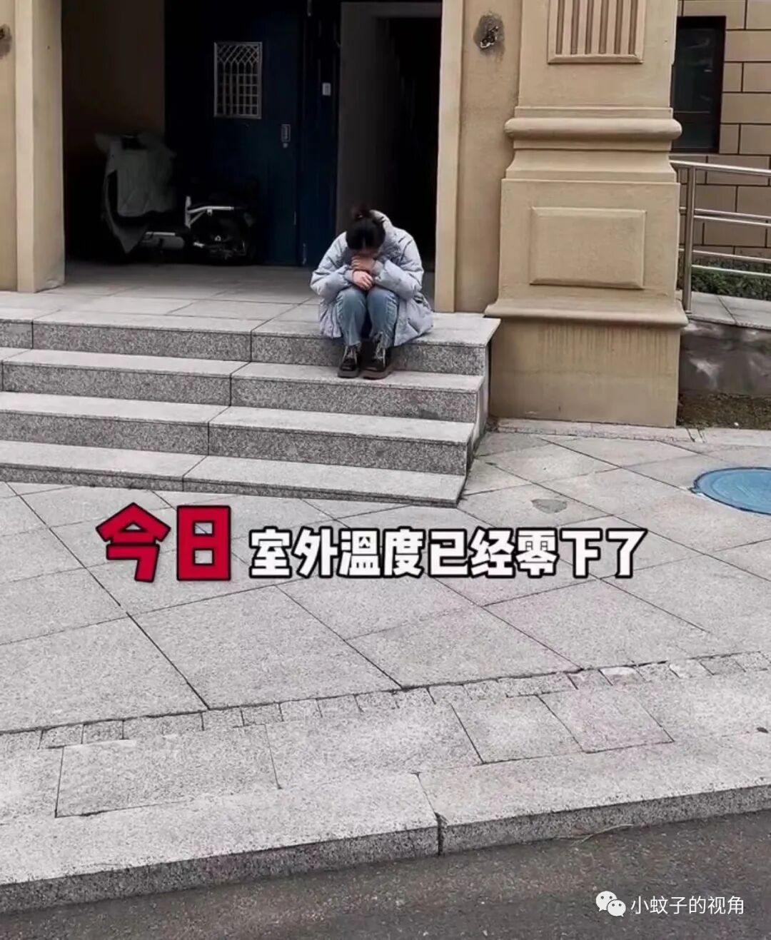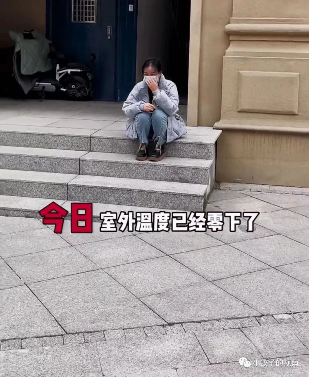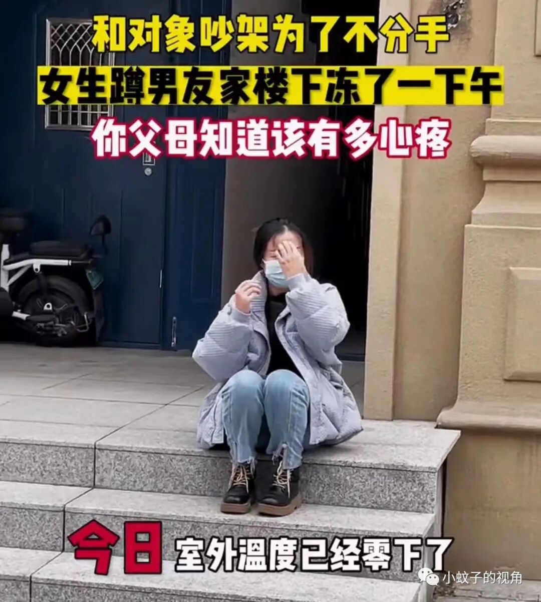 当时室外的气温在零度以下,女孩偶尔会站起来走动两圈,走累了再次坐在台阶上。仿佛她这样的行为就能感动男友一样。