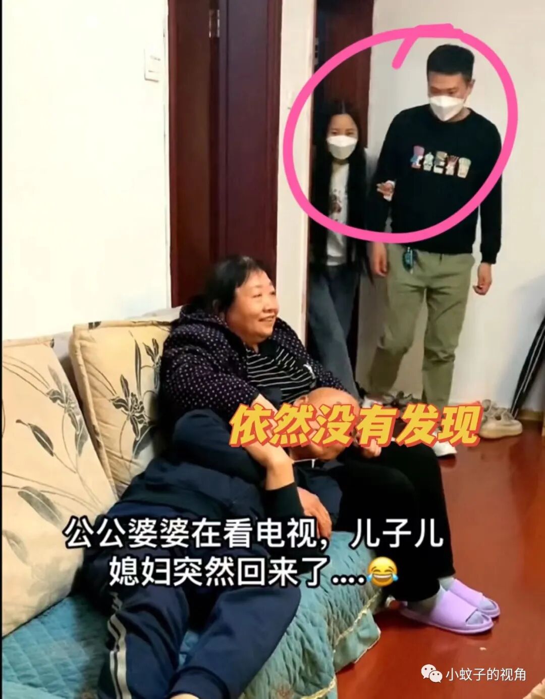只是没想到,说是外出看电影的儿子儿媳却突然回来了,儿子推门而入的时候没有说话,老两口也因为看电视太入迷,并没发现儿子回来。