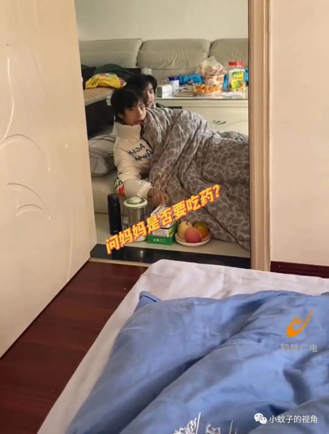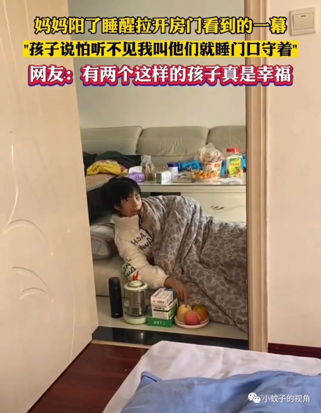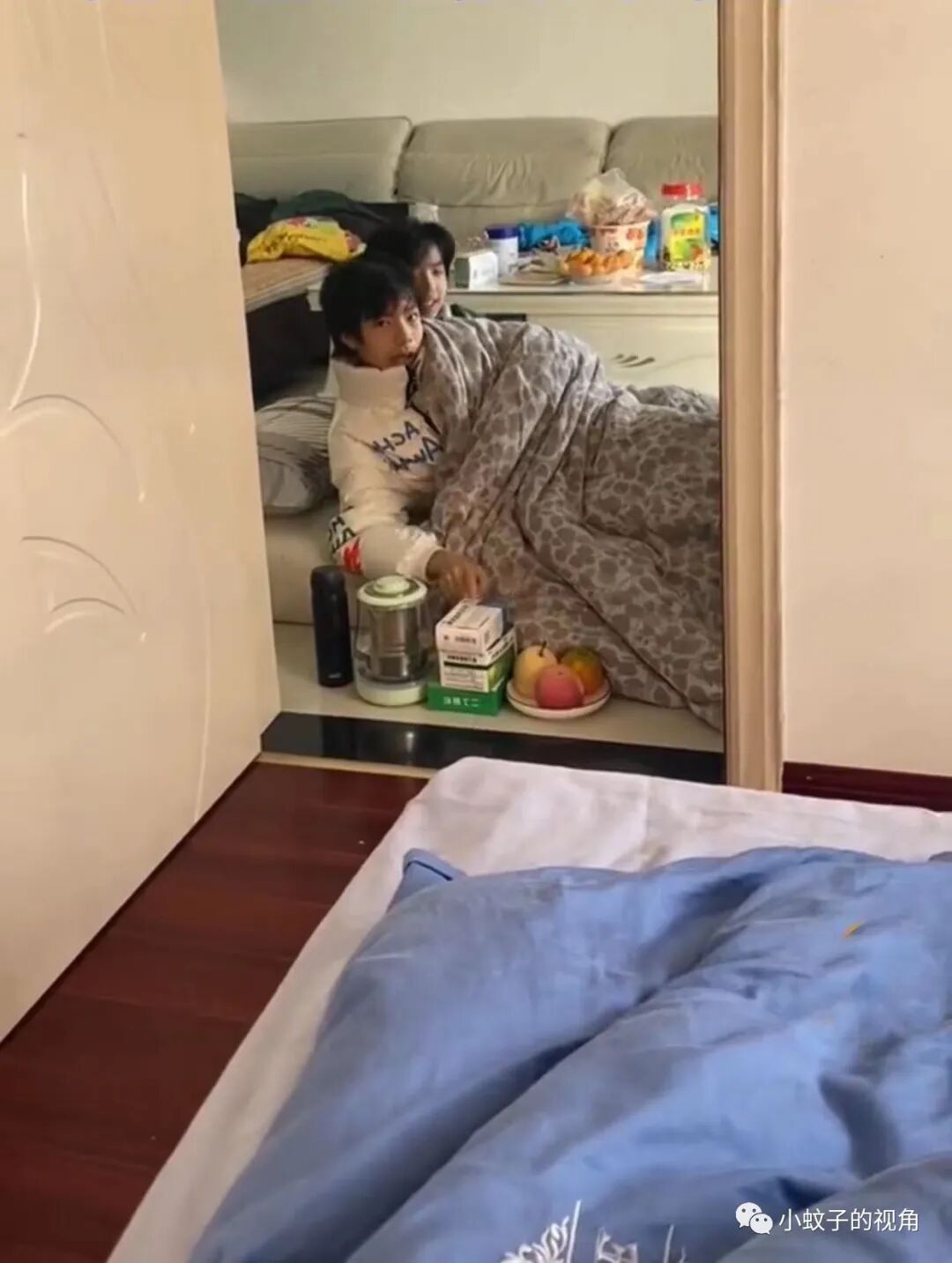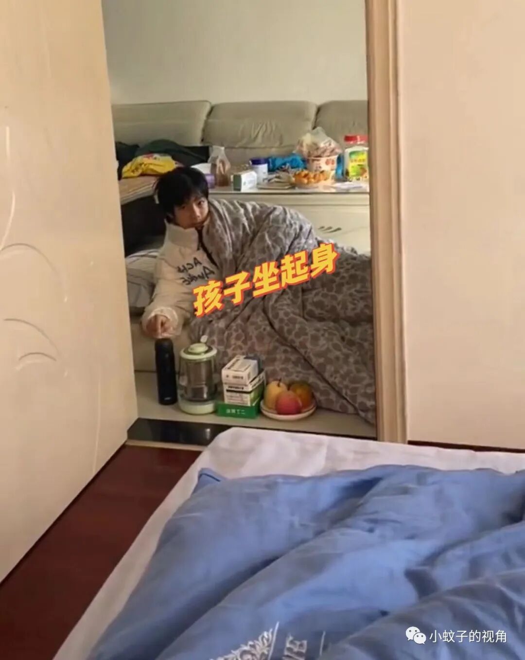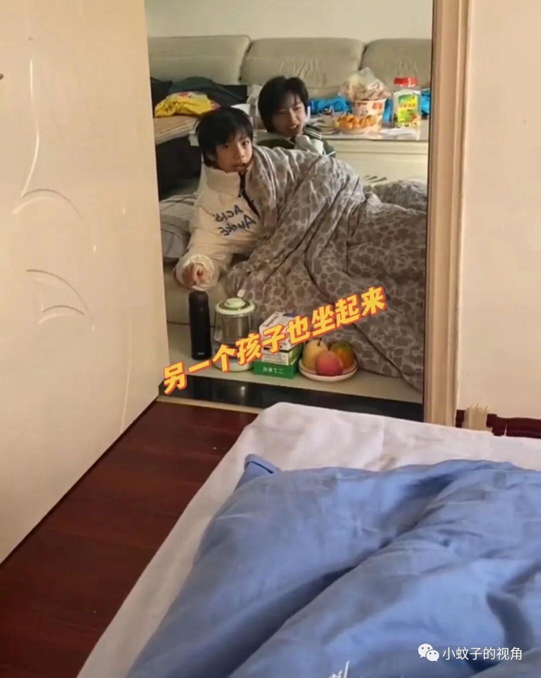 两个孩子并没有在房间休息,而是在她卧室门口打了地铺,地铺旁边一字摆开,放着保温杯、茶水壶、药物和水果。