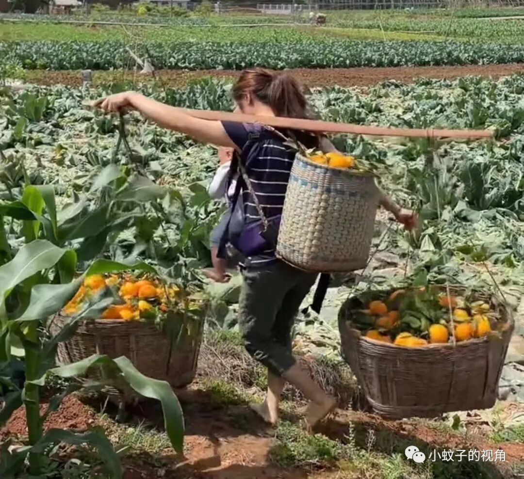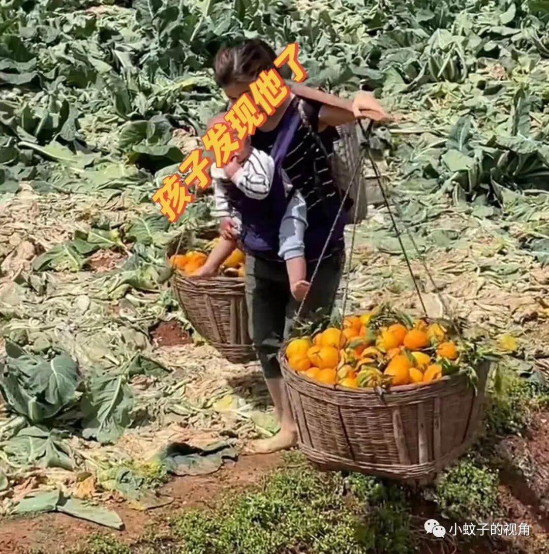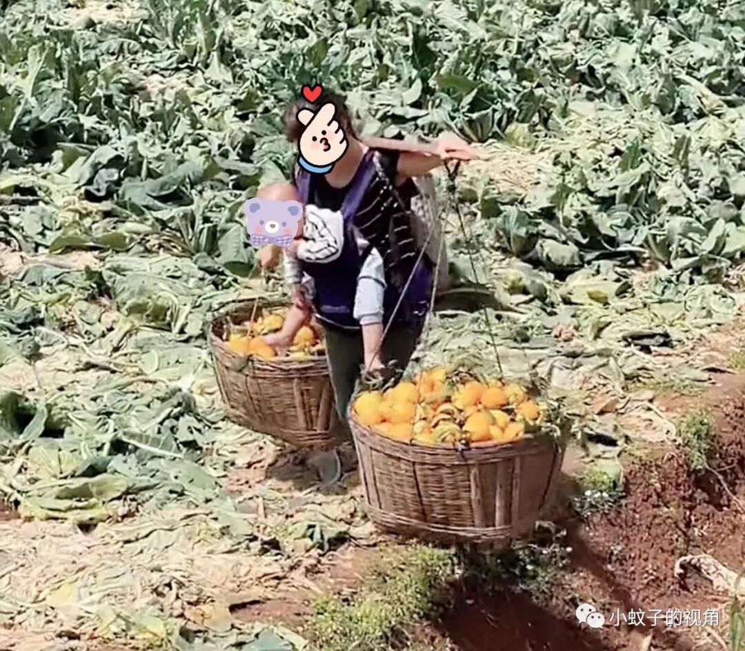还没走到他就看到了妻子,妻子正光着脚丫踩在地里的泥土上,孩子挂在她胸前,肩膀上挑着两筐水果,背上还背着一篓,正是他今天要采摘的。