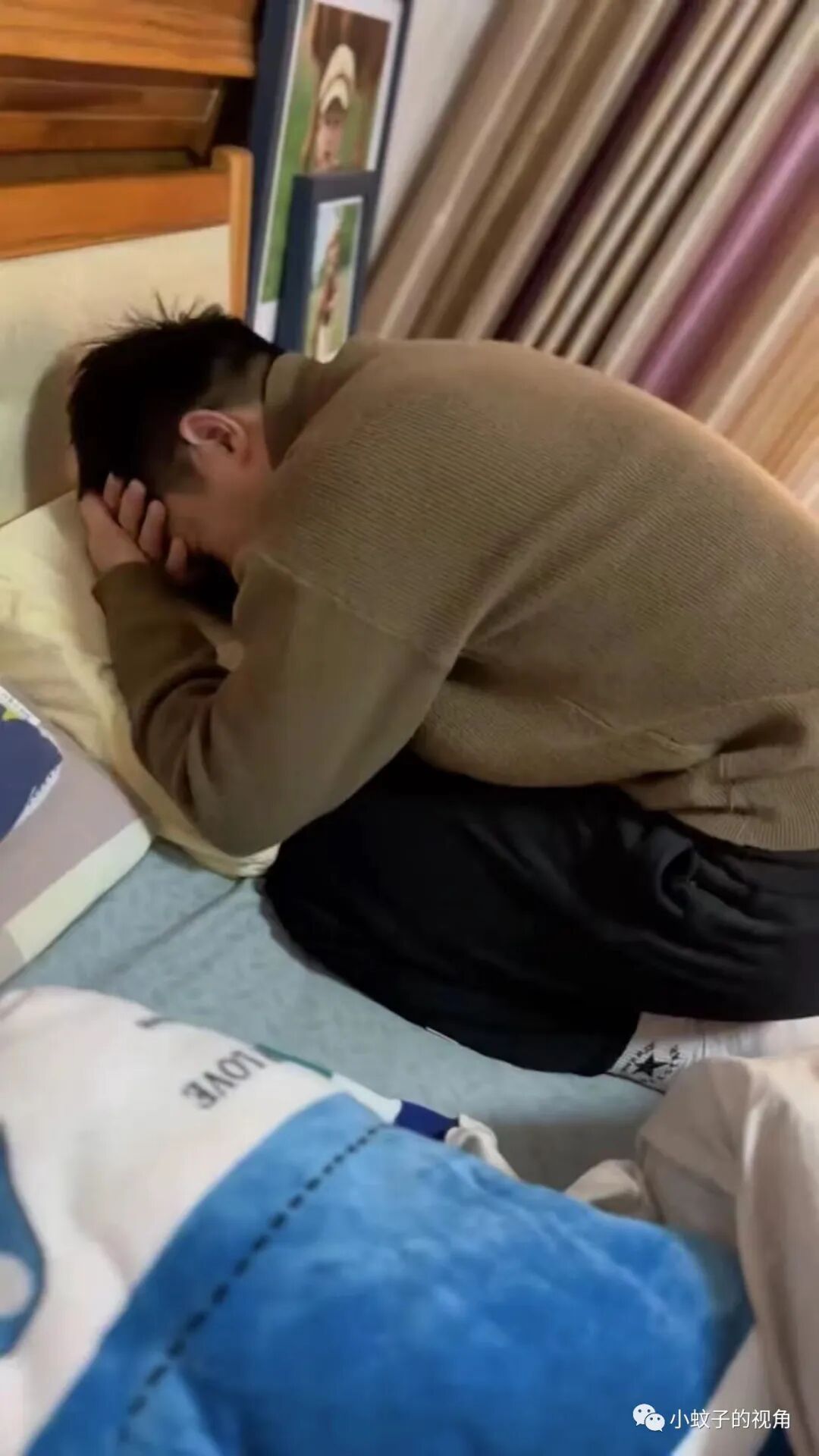 这名男子也不例外,这样的姿势没有维持不了多久,十几分钟后就坚持不住了!只好换个姿势,双手扒着床头,半跪着将脑袋放在床头上,再坚持十几分钟。