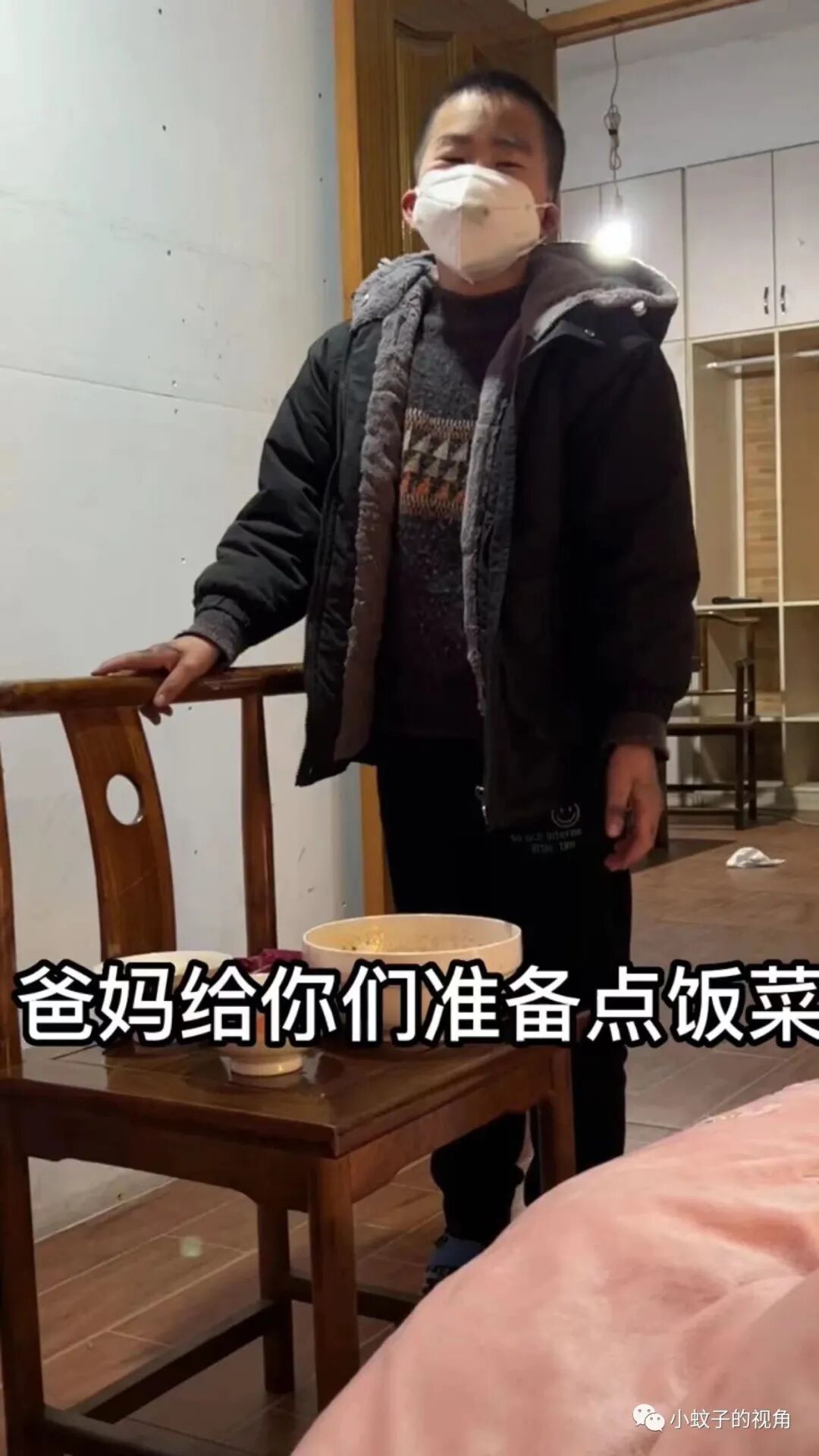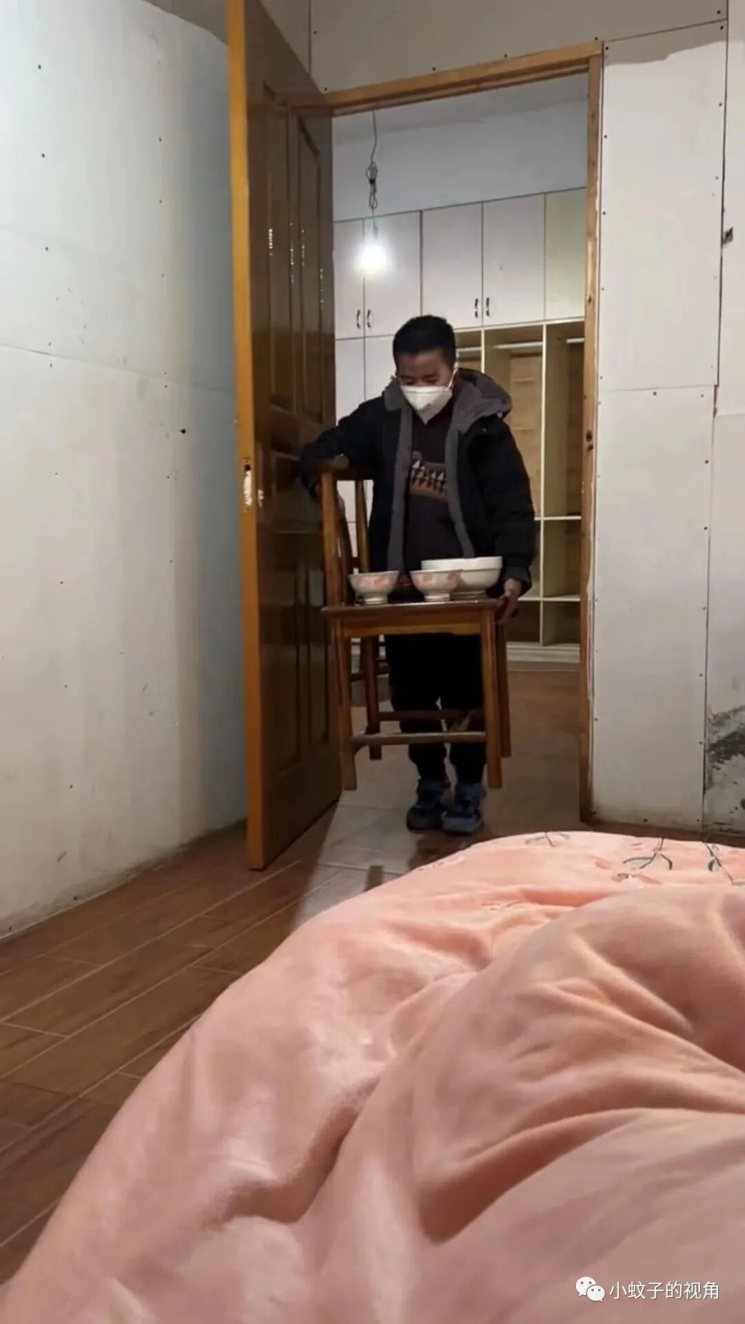 看着儿子戴着口罩,椅子上放着一盆汤,两碗米饭,搬着椅子送到了卧室。女子感到非常欣慰,儿子原来这么懂事!