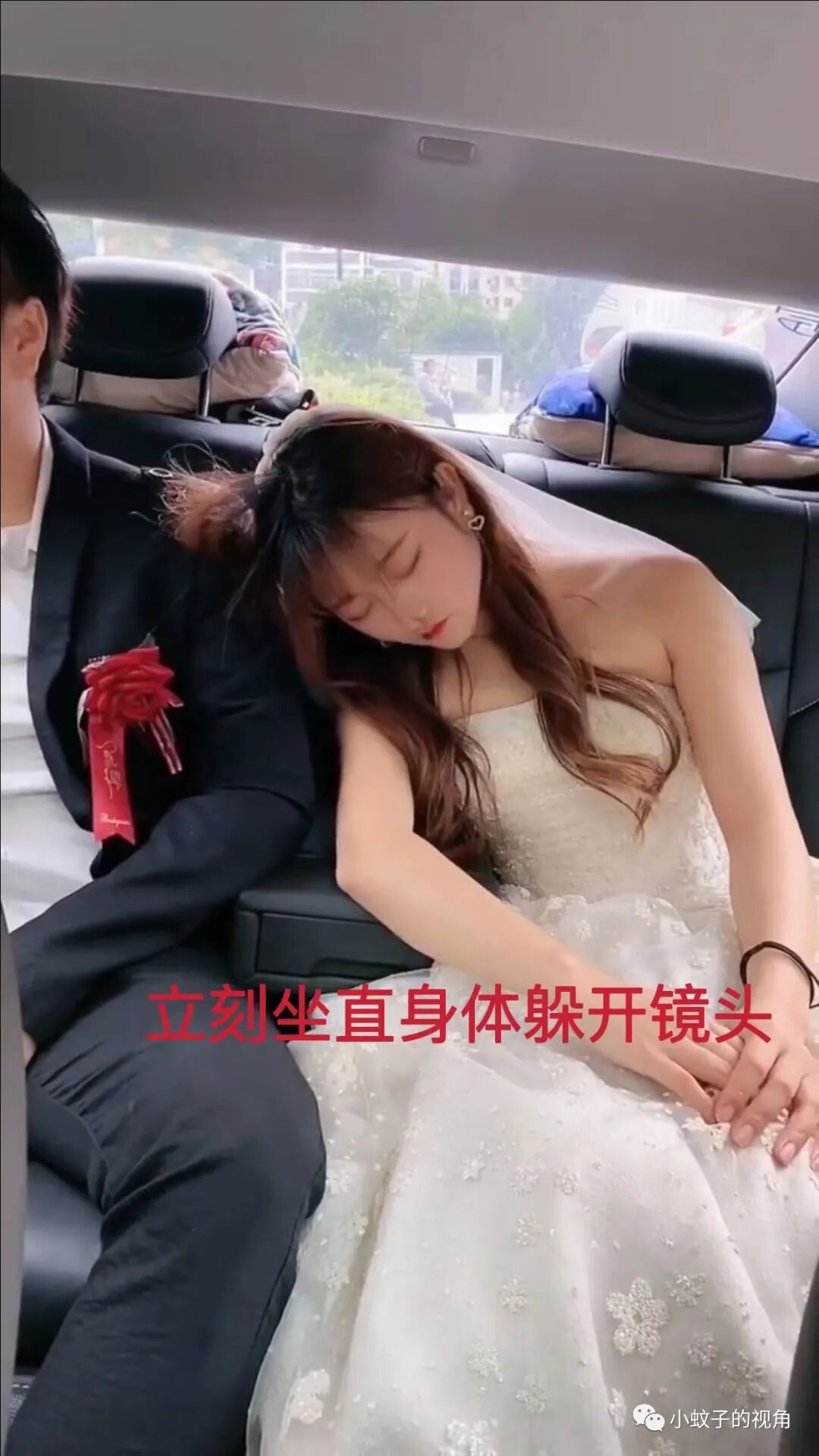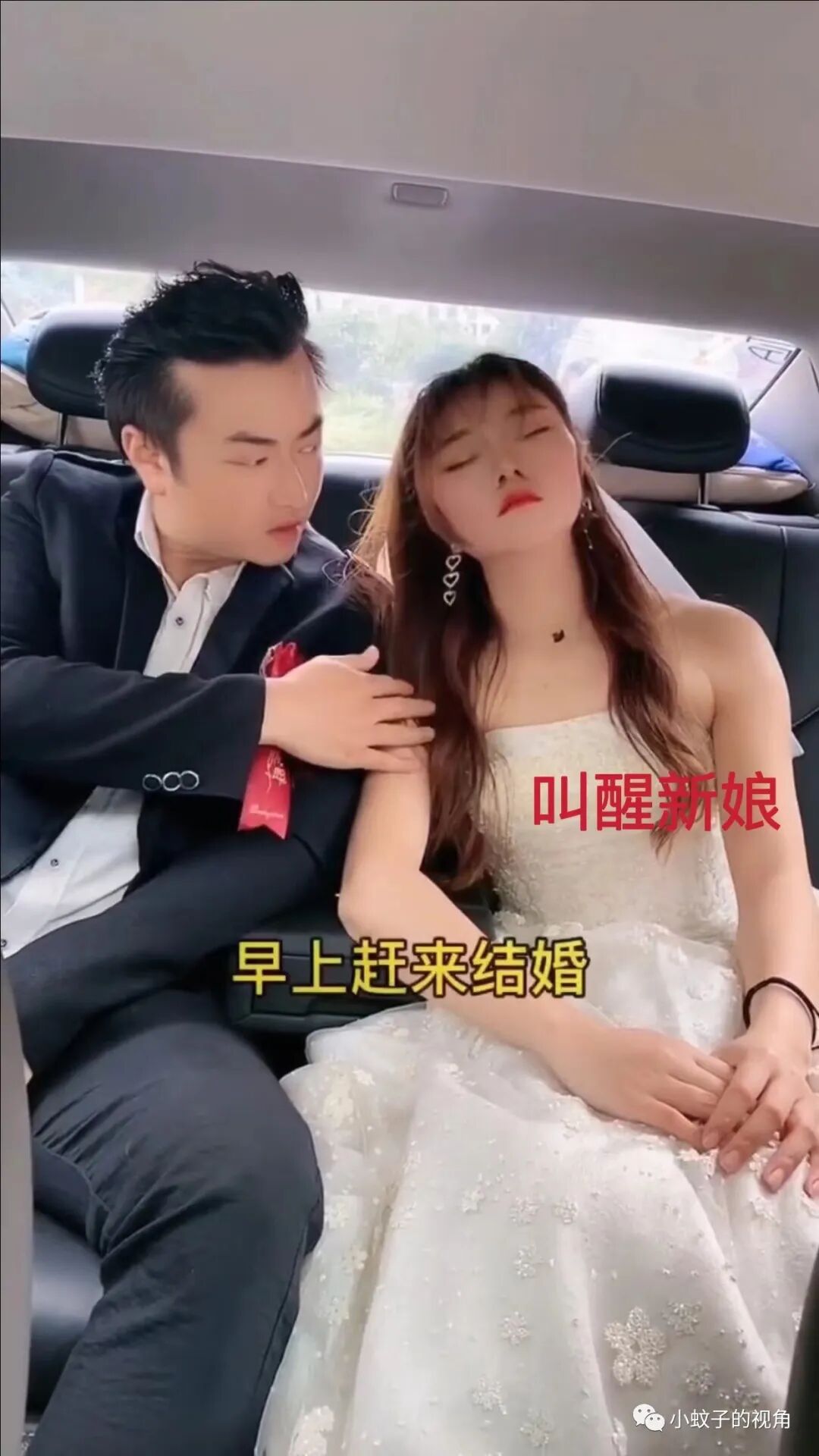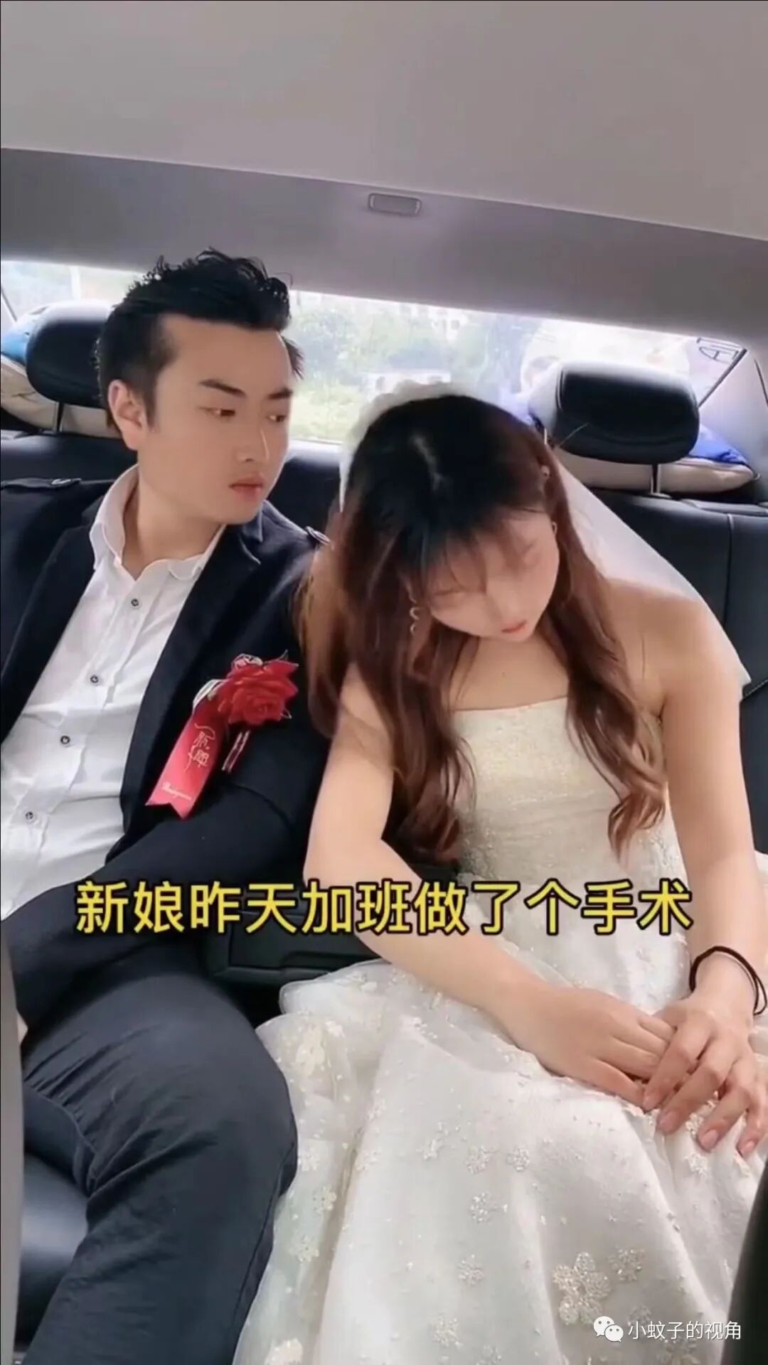 加上新娘刚加班做完手术,身体有点吃不消,上了婚车坐在老公身边后,身心一放松立马就困得睁不开眼了。