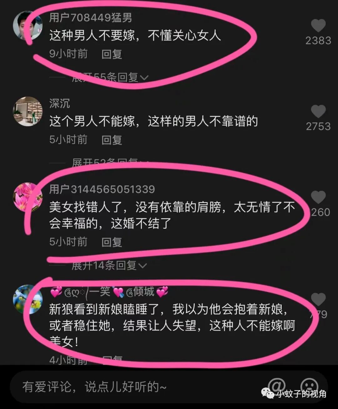 还有网友说:美女找错人了,没有依靠的肩膀,太无情了,不会幸福的,这婚不结了吧!
