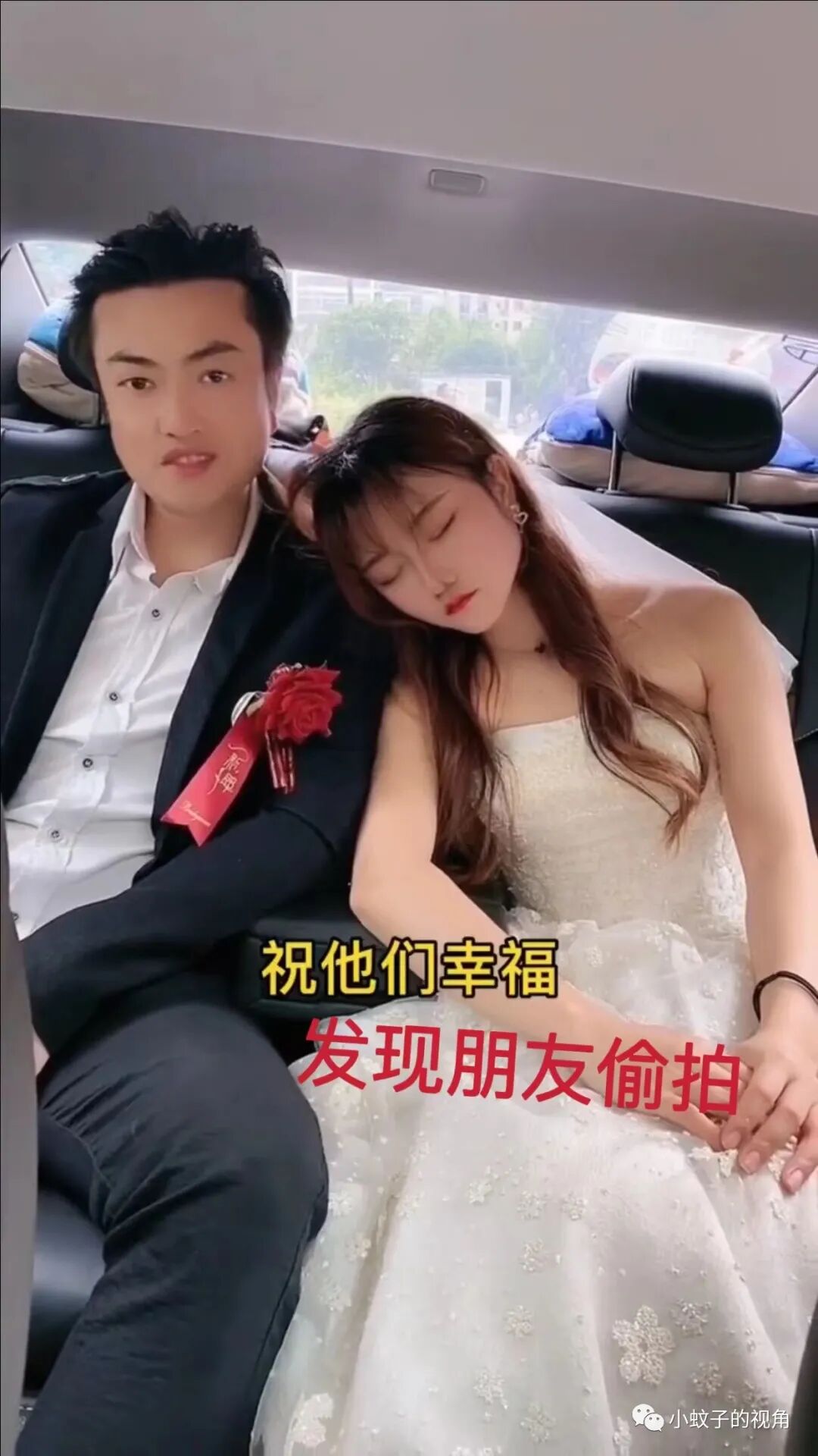 坐在副驾驶朋友看着新娘困得厉害,忍不住打开手机拍照。这时新郎也发现了新娘正在打盹。