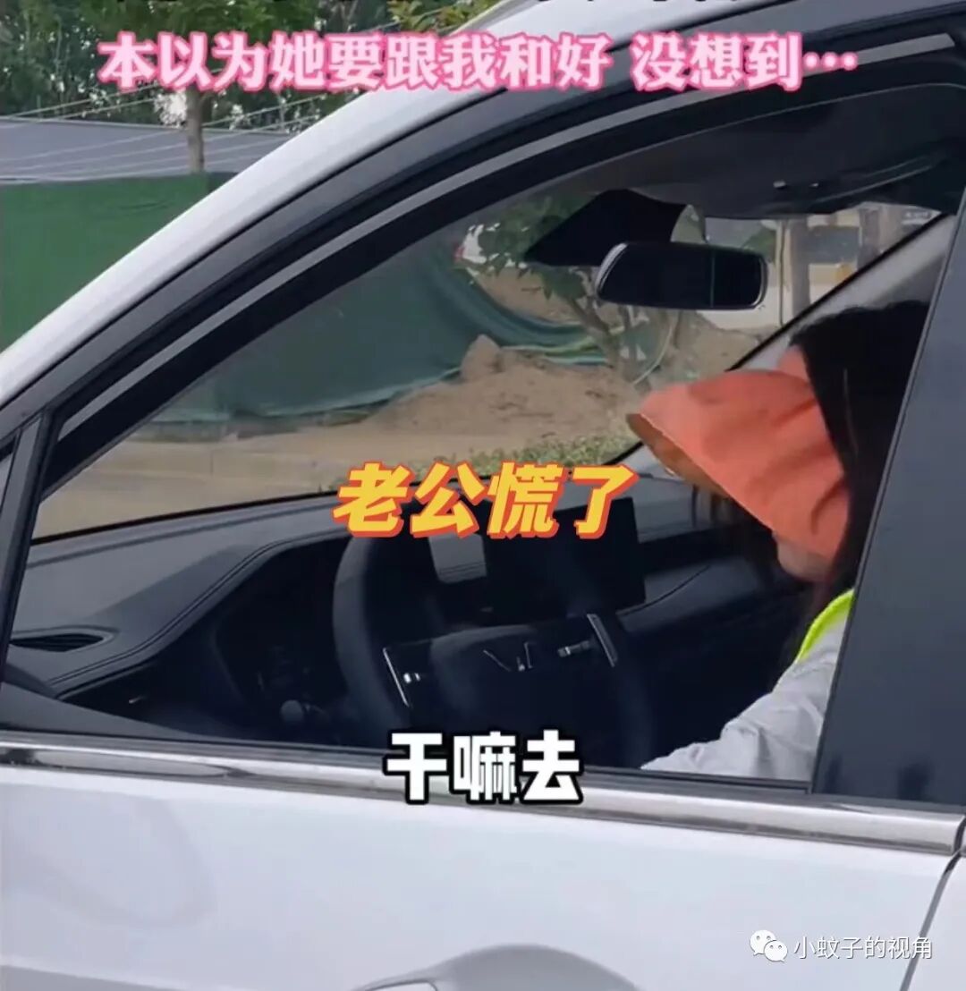 妻子瞄了一眼他正在录像的手机,没有理他,从他身边转过去就上了驾驶座,转身关上车门开起来就走了。