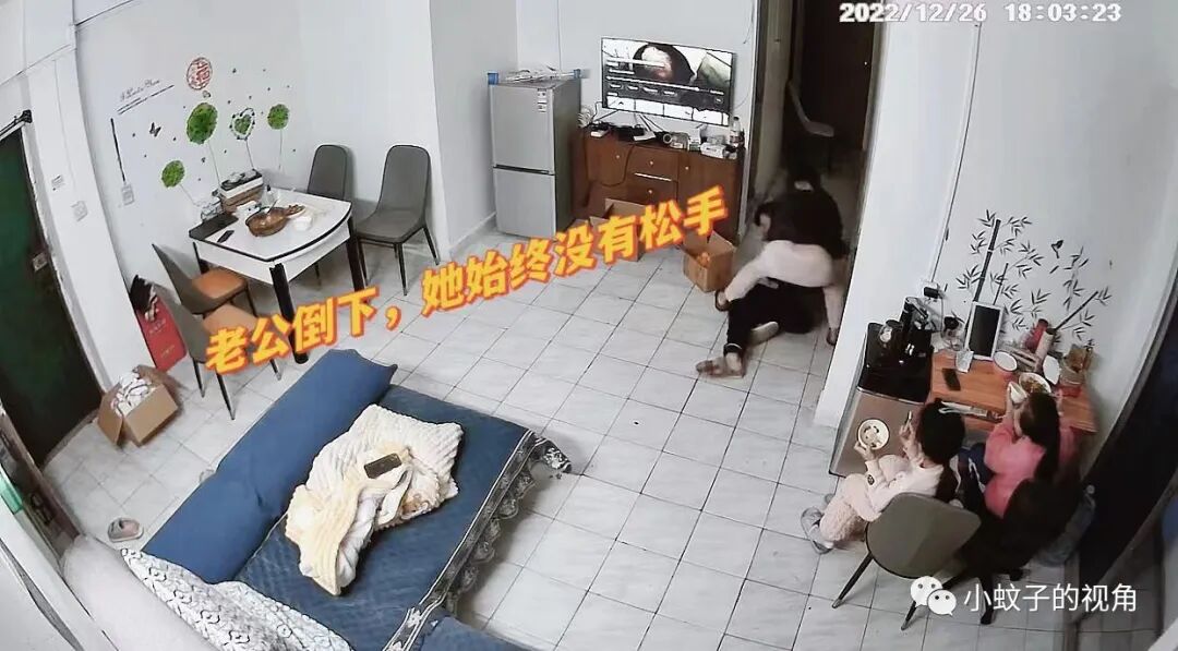 老公晃了几下还是倒在了地上,期间妻子一直用力抱着老公,减缓他倒下的速度。等老公身体躺在地上以后,她还跪在地上抱着老公的上半身,避免他头部着地。