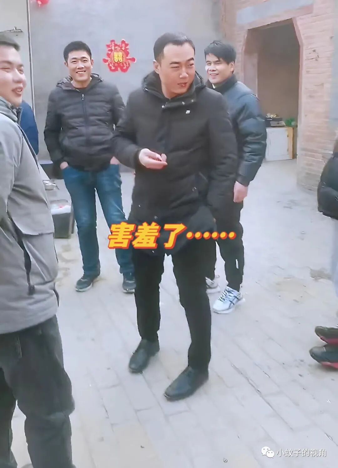 最近村里有人办喜事,老公正在别人家帮忙,跟好几个男人站在一起聊天呢。女子手里拿着两块喜糖走过去,将这糖塞进老公手里。