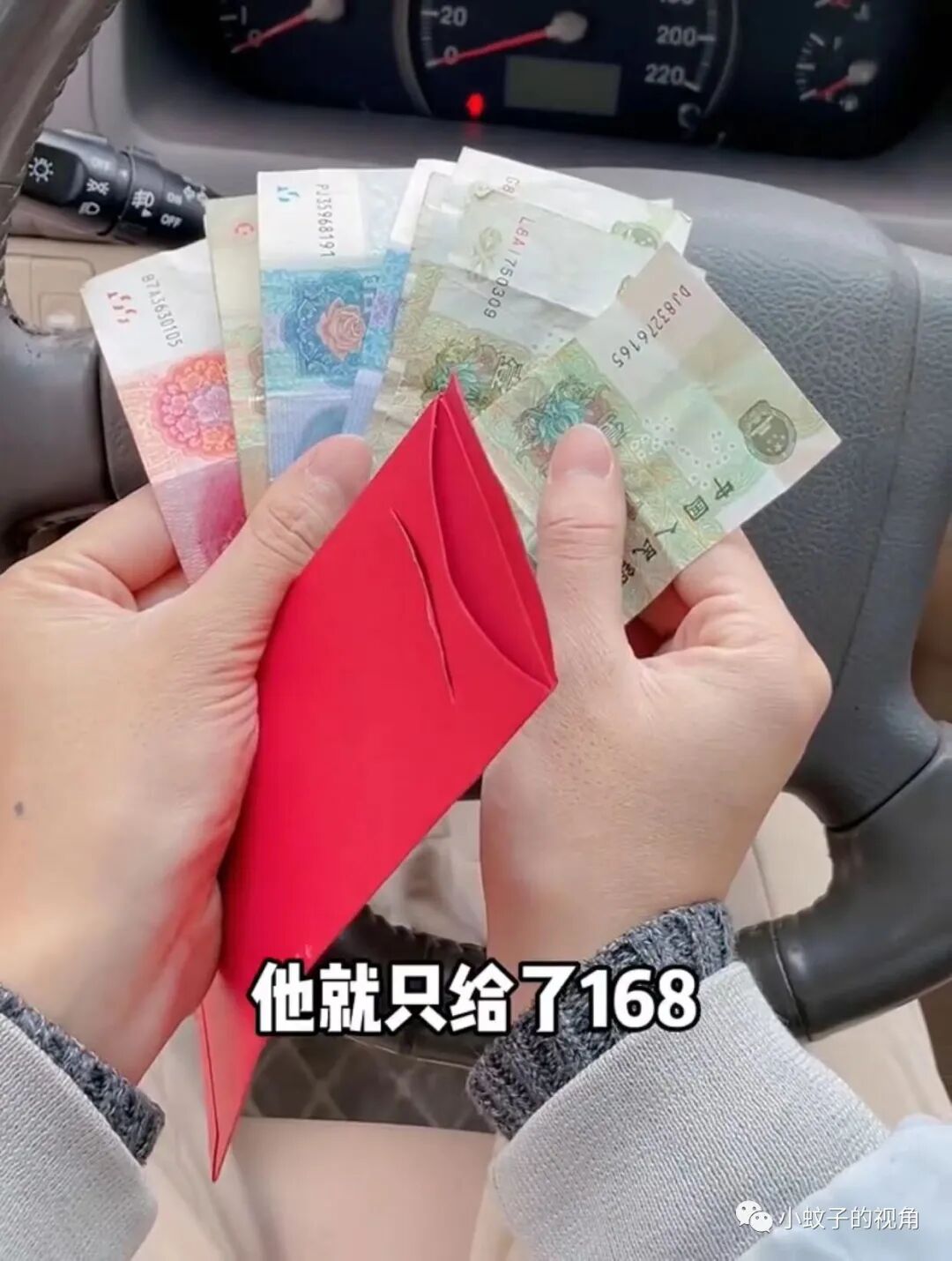 原来,红包里面只有一张一百的,剩下的全都是二十的、十块的、五块的还有三张一块的。放在一起觉得厚厚的,其实一共只有168块钱!
