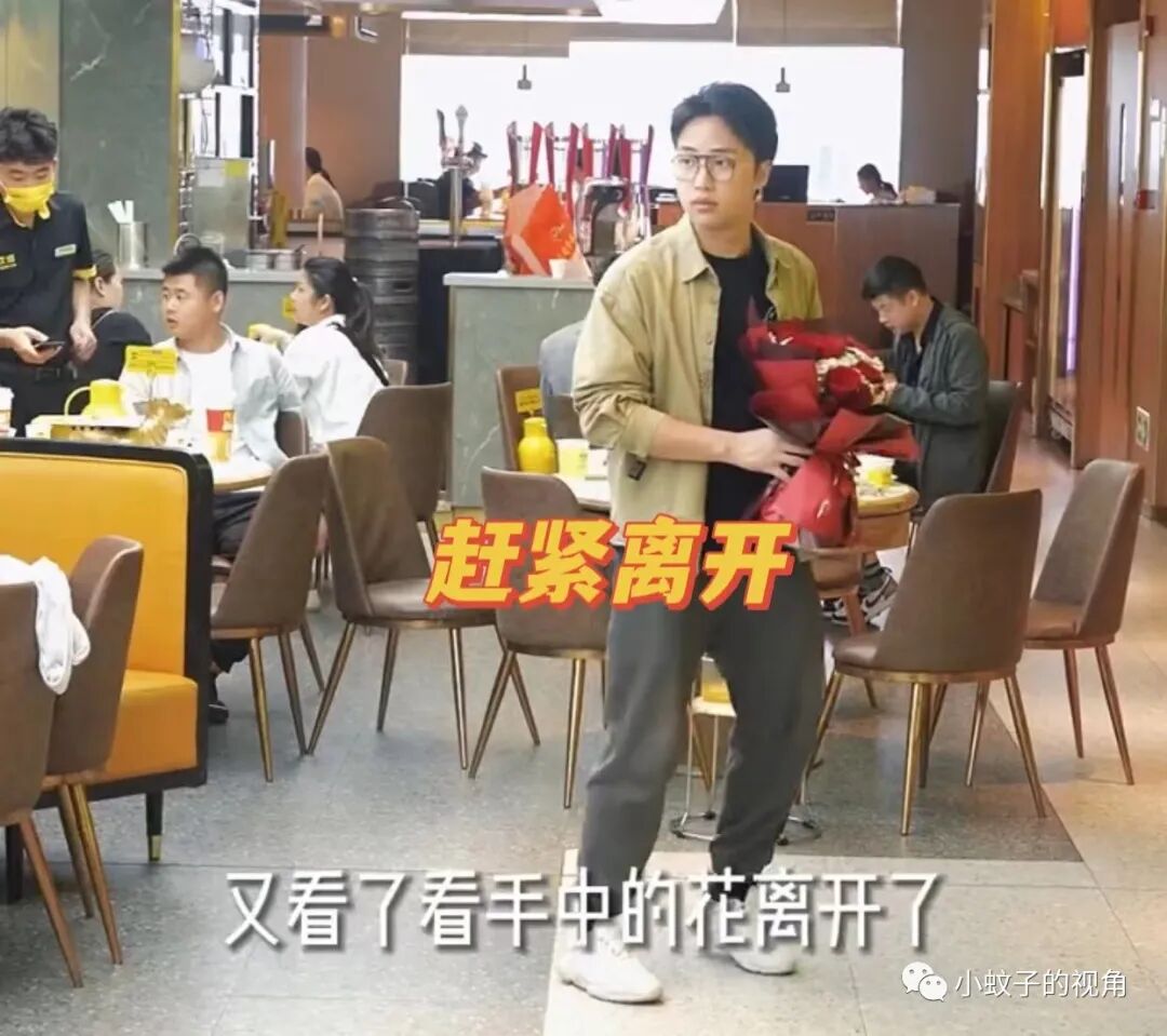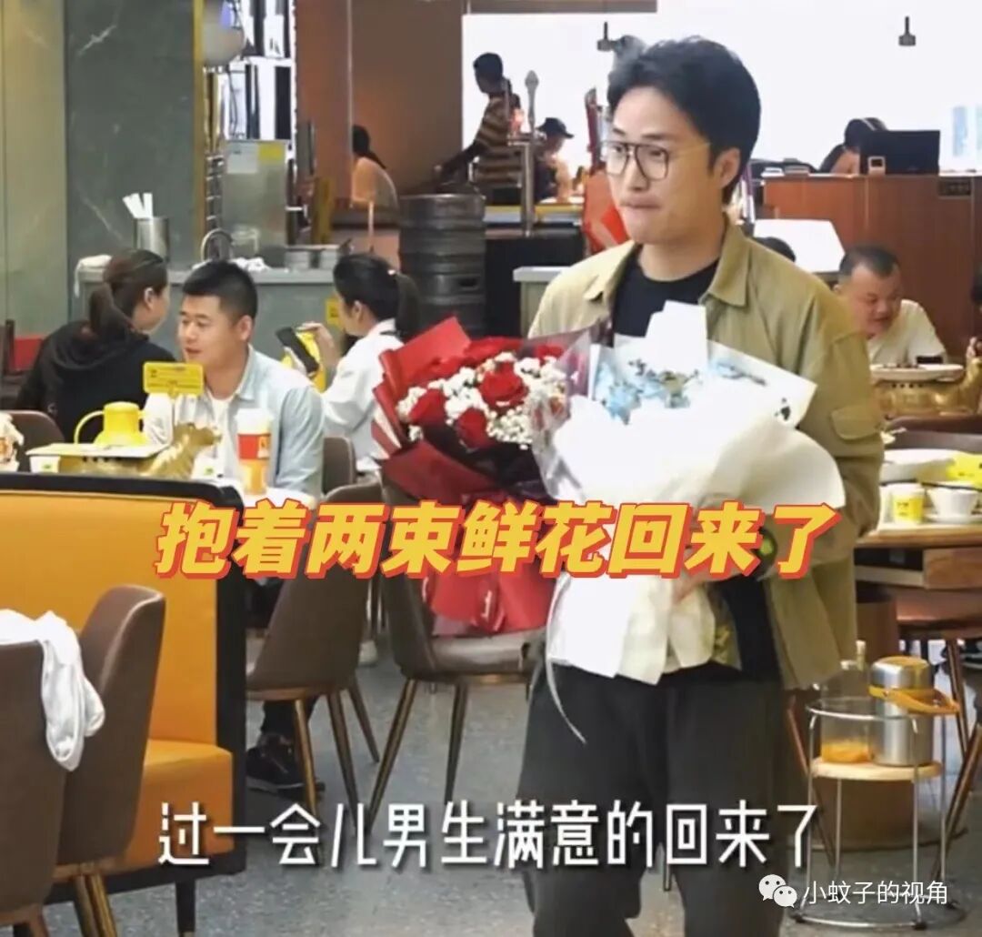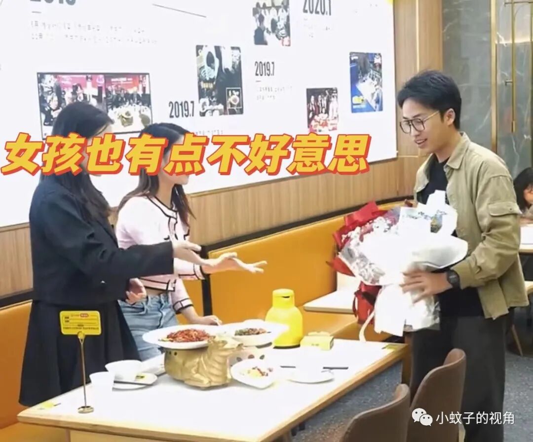 看到两束鲜花女孩也有点懵,赶紧站了起来请男孩落座,男孩有点紧张差点分不清哪个是相亲对象,只好一股脑地把两束鲜花送给了两位女孩。
