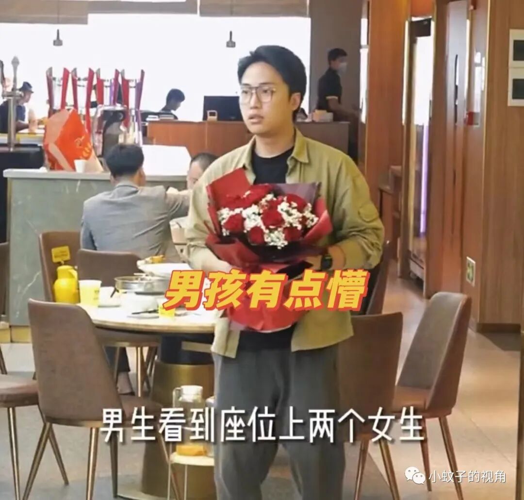 怀里抱着鲜花的男孩看到座位前有两名女孩的时候也是有点懵:怎么两个?一时间都分不清哪个才是我相亲对象?