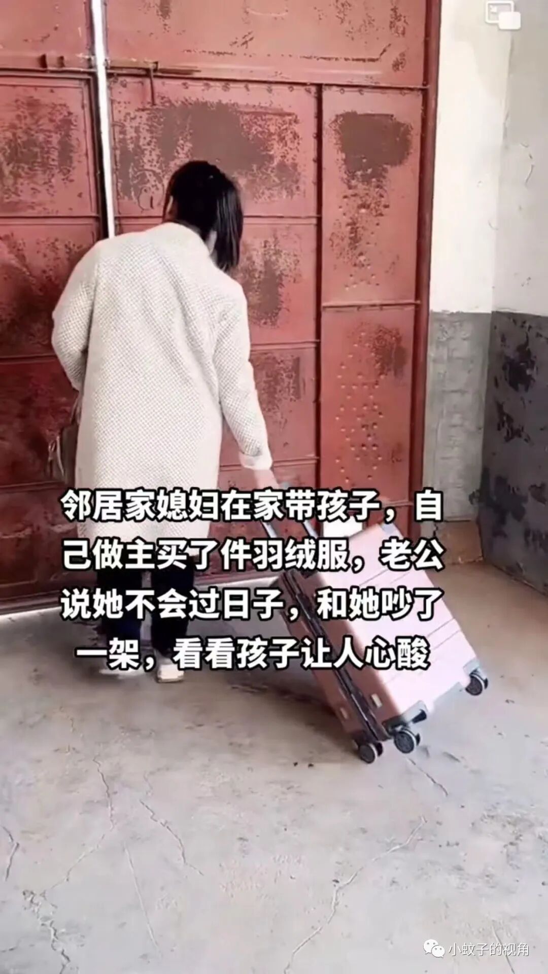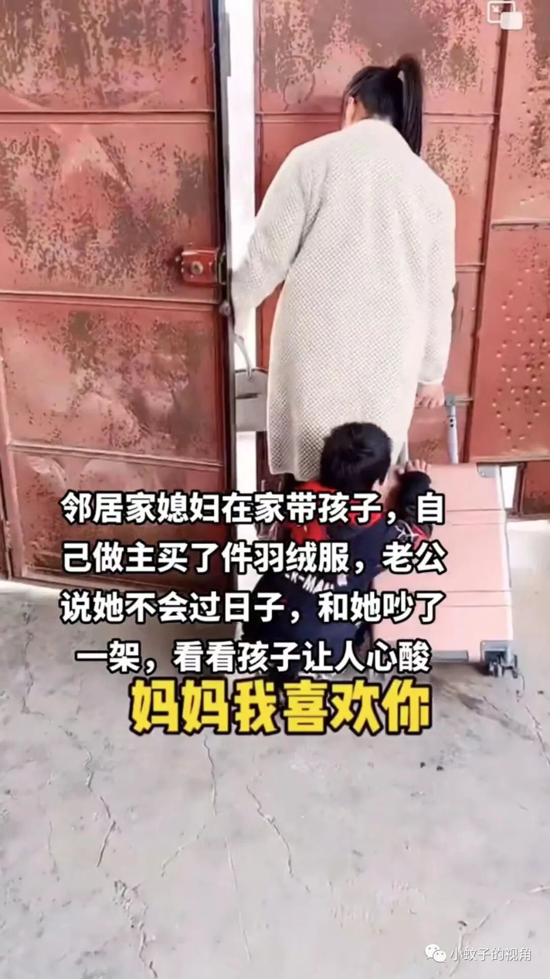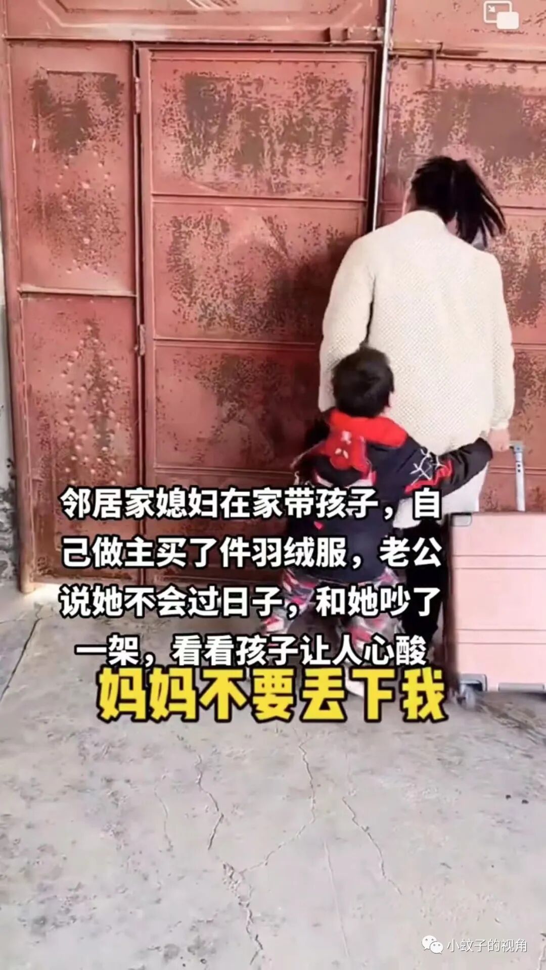 就像这位女子一样,作为全职妈妈的她,跟老公吵架后,拉着行李箱就走,孩子跳着脚大哭,一句“妈妈别丢下我”令人泪目。