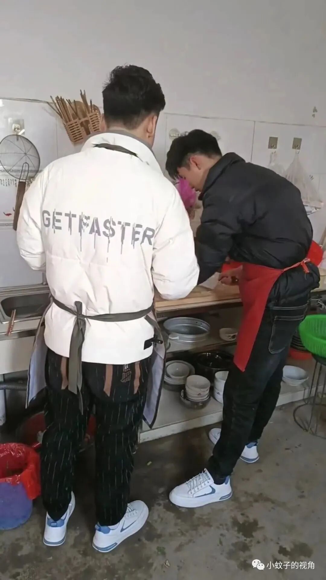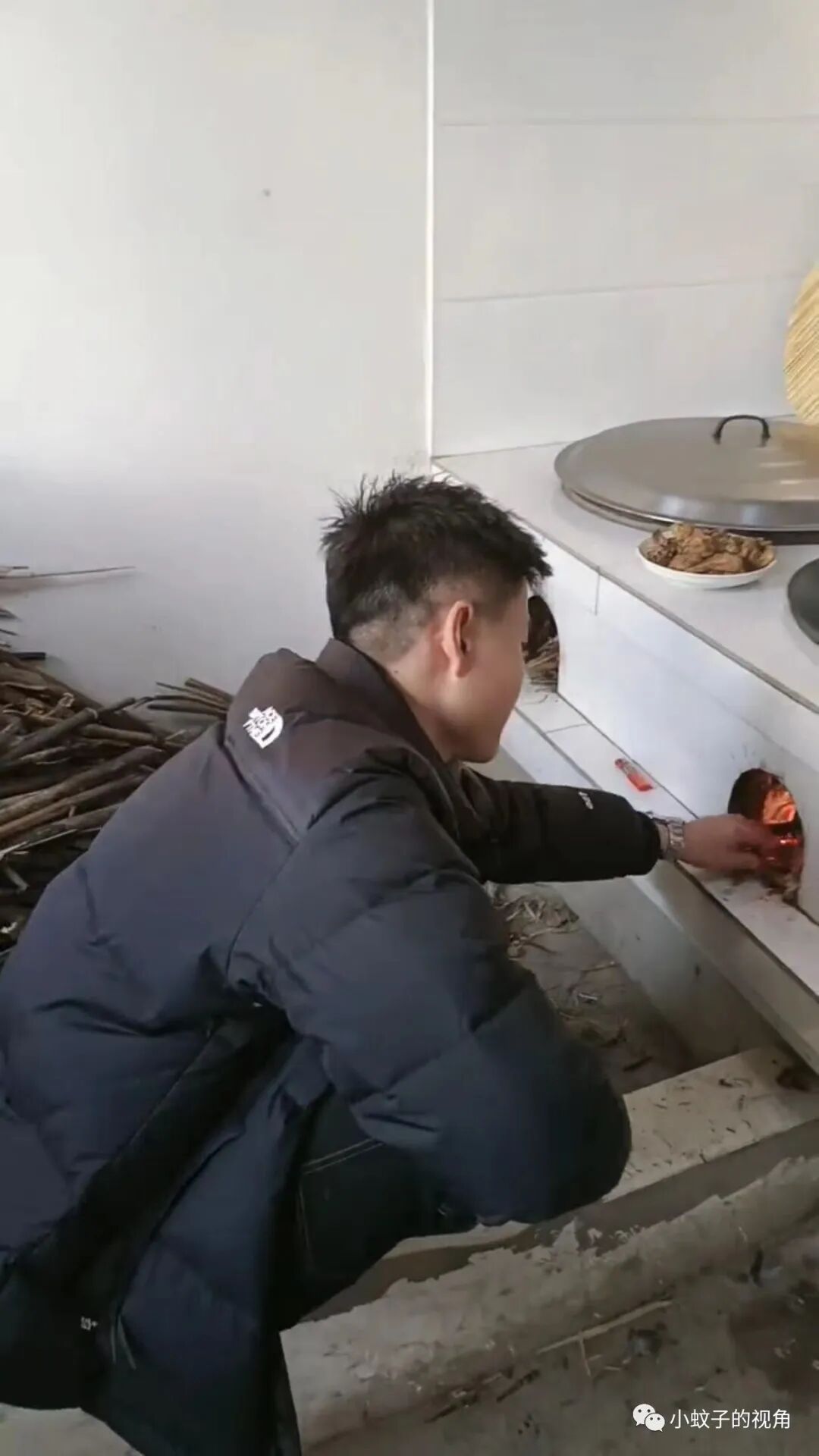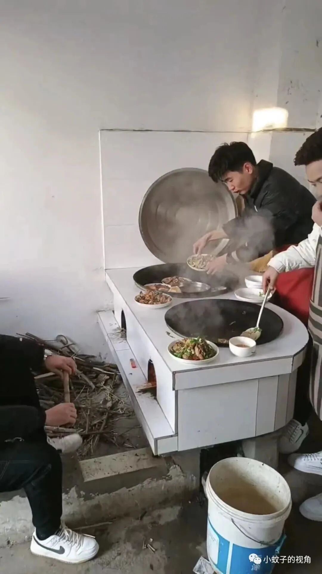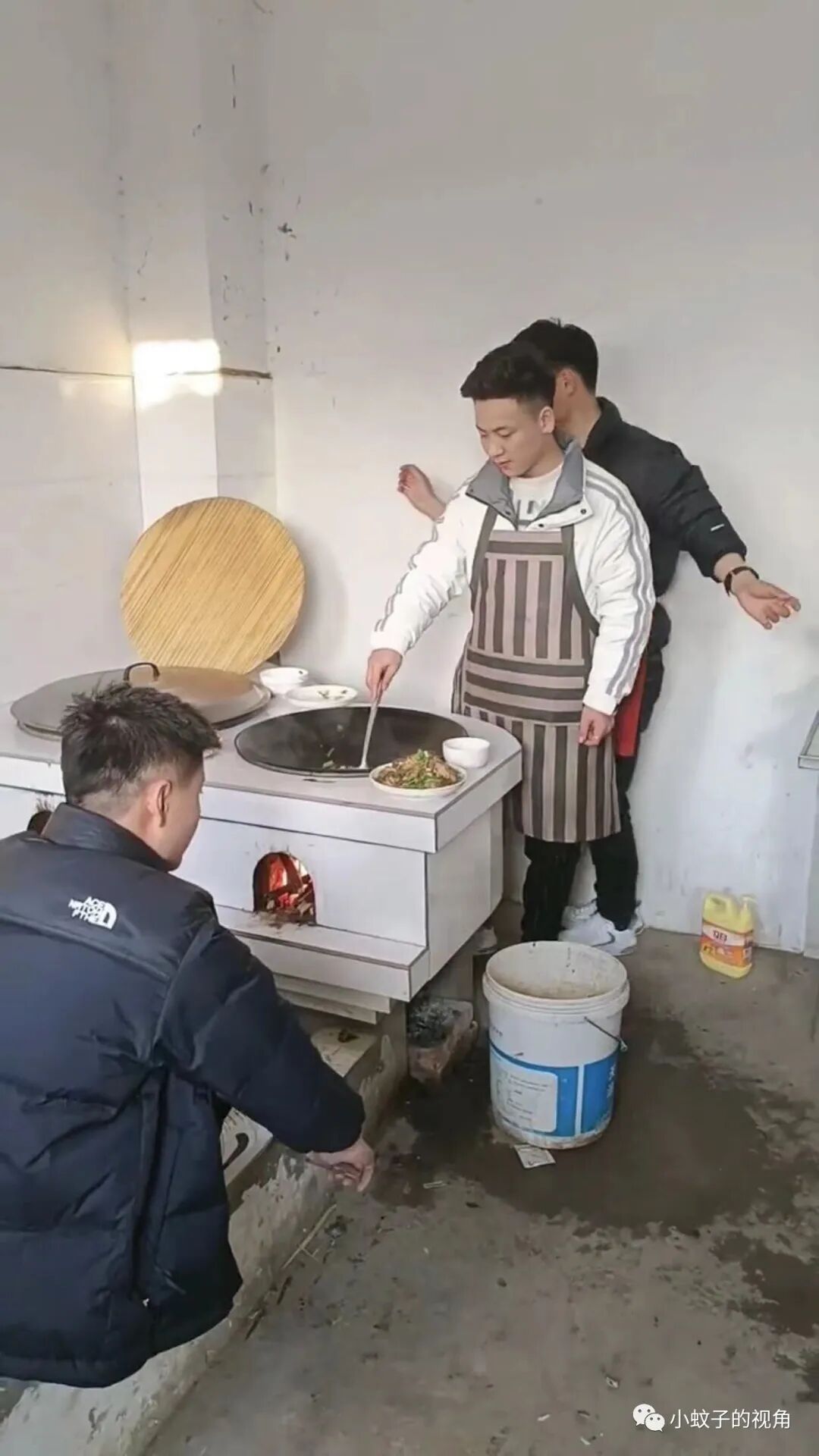 据这位女子介绍,这三位正在做饭的帅哥都是她儿子,一个人在烧火,一个人准备菜品,还有一个人忙前忙后的在炒菜。