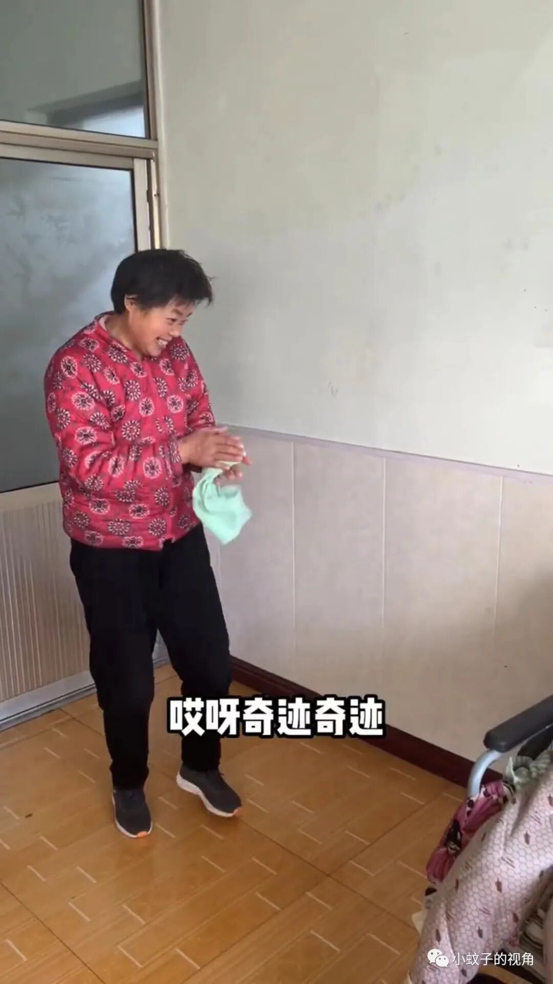 女子愣了一下后,高兴地跳起来!一边跳一边大笑:“哈哈哈,奇迹、奇迹!我的亲娘来!她说饱了!”