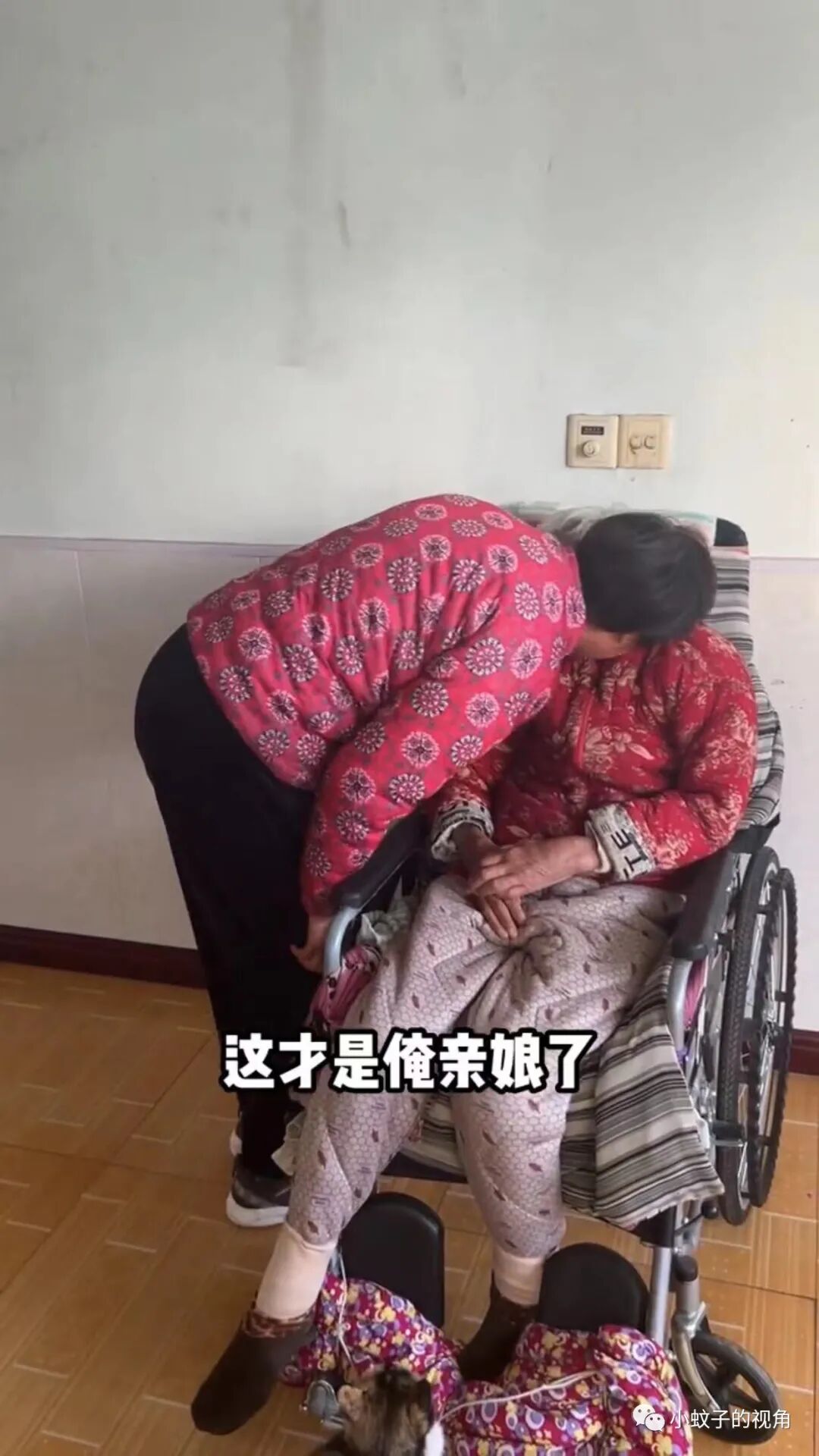 女子一边笑,一边高兴地将脸蹭过去,想给老人一个拥抱,高兴之情溢于言表:“哈哈哈,这才是我的亲娘……”