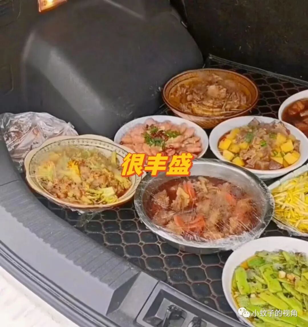 这些饭菜全部用装在盘子里,再用保鲜膜盖好,一盘一盘摆放在后备箱里,摆放了整整一后备箱饭菜。