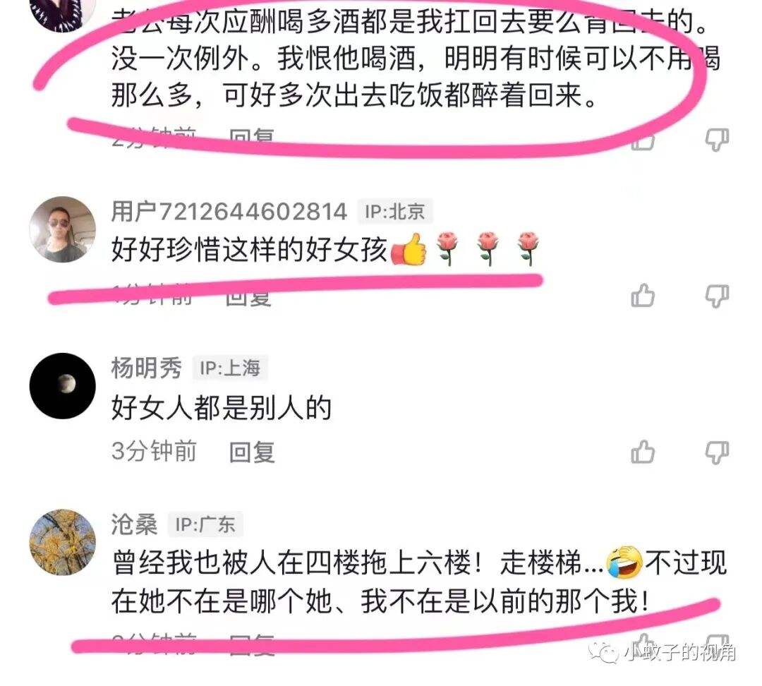 也有女性网友说:老公每次应酬喝多酒都是我扛回来,要么就是背回来,没有一次例外。我恨他喝酒,明明有时候可以不用喝那么多,可是他总是出去吃饭就醉着回来。
